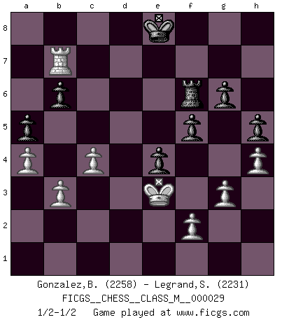 Last move : 1/2-1/2 2010 December 12 23:43:34 [Event "FICGS__CHESS__CLASS_M__000029"] [Site "FICGS"] [Date "2009.07.01"] [Round "1"] [White "Gonzalez,Bolivar"] [Black "Legrand,Stephane"] [Result "1/2-1/2"] [WhiteElo "2258"] [BlackElo "2231"] 1.e4 e5 2.Nf3 Nf6 3.d4 Nxe4 4.Bd3 d5 5.Nxe5 Nd7 6.O-O Nxe5 7.dxe5 Nc5 8.Nc3 c6 9.Ne2 Be7 10.Nd4 O-O 11.Re1 Nxd3 12.Qxd3 Re8 13.Bf4 Bc5 14.Be3 Qd7 15.Nf3 Bf8 16.h3 Qf5 17.Qb3 a5 18.a4 Qg6 19.Kh2 Qh5 20.Bf4 Bc5 21.Be3 Be7 22.Bd2 b6 23.Nd4 Bc5 24.c3 Rxe5 25.Nxc6 Re4 26.Nd4 Bd7 27.Rxe4 dxe4 28.Bf4 Qh4 29.Bg3 Qg5 30.Qc4 h5 31.h4 Qg4 32.Re1 Rc8 33.Qd5 Re8 34.b3 Re7 35.Nc2 Qe6 36.Qxe6 Rxe6 37.Rd1 Bc6 38.Ne3 f6 39.Bf4 Kf7 40.Kg1 Bb7 41.Kf1 g6 42.Ke2 Bc8 43.Rd8 Rc6 44.Nd5 Bg4+ 45.Ke1 Be6 46.c4 Bxd5 47.Rxd5 f5 48.Rd7+ Ke6 49.Rg7 Kf6 50.Rb7 Ke6 51.Ke2 Bd4 52.Bg5 Rc8 53.g3 Rc6 54.Re7+ Kd6 55.Re8 Kc7 56.Bf4+ Kd7 57.Rg8 Re6 58.Ra8 Bc5 59.Ra7+ Ke8 60.Rg7 Bd4 61.Rb7 Rf6 62.Be3 Bxe3 63.Kxe3 1/2-1/2 Petrov : Modern attack, Symmetrical variation Kingside Castling by player White (move 6) Kingside Castling by player Black (move 10) This chess game ended in a draw. Follow this game move after move (download)I look one move ahead... the best ! (Siegbert Tarrasch) Das Spiel gibt uns die Genugtuung, die das Leben uns versagt. (Emanuel Lasker) Las ideas audaces son como las piezas del Ajedrez que avanzan hacia adelante. Ellas pueden ser vencidas, pero también pueden iniciar una partida victoriosa. (Goethe) L'action d'une oeuvre littéraire se déroule sur un champ de bataille. Les masques et les types du drame moderne correspondent aux pièces du jeu d'échecs. L'intrigue correspond aux coups et aux gambits, c'est à dire aux techniques du jeu telles qu'utilisées et interprétées par les joueurs. Les tactiques et les péripéties [mouvements] correspondent aux coups exécutés par l'adversaire. (Viktor Shklovsky) Whenever people agree with me, I always feel I must be wrong. (Oscar Wilde)