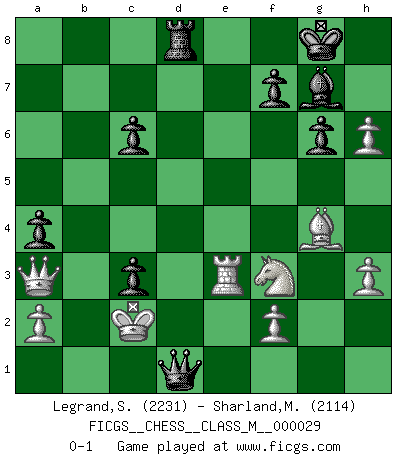 Last move : 0-1 2010 April 30 4:40:37 [Event "FICGS__CHESS__CLASS_M__000029"] [Site "FICGS"] [Date "2009.07.01"] [Round "1"] [White "Legrand,Stephane"] [Black "Sharland,Michael"] [Result "0-1"] [WhiteElo "2231"] [BlackElo "2114"] 1.d4 Nf6 2.c4 e6 3.Nf3 d5 4.Nc3 c6 5.e3 Nbd7 6.Qc2 Bd6 7.g4 dxc4 8.Bxc4 e5 9.g5 Nd5 10.Bd2 exd4 11.Qe4+ Ne7 12.Qxd4 Nf5 13.Qe4+ Ne7 14.Qc2 O-O 15.Ne4 Nb6 16.Be2 Ned5 17.O-O-O Re8 18.Rhg1 Bf5 19.Bd3 g6 20.Kb1 Bf8 21.Ba5 Bg7 22.Nf6+ Bxf6 23.Bxf5 Bxb2 24.Bg4 Bg7 25.e4 Qd6 26.exd5 Nxd5 27.h3 Qa3 28.Bd2 a5 29.Qb3 Qd6 30.Rge1 Red8 31.Qc2 a4 32.Qc4 b5 33.Qc1 b4 34.Be3 Rab8 35.Bd4 Nc3+ 36.Bxc3 bxc3 37.Kc2 Qc5 38.Rxd8+ Rxd8 39.Re3 h5 40.gxh6 Qd5 41.Qa3 Qd1+ 0-1 Queen's pawn game Kingside Castling by player Black (move 14) Queenside Castling by player White (move 17) Player Black won this chess game. Follow this game move after move (download)Capture of the adverse King is the ultimate but not the first object of the game. (William Steinitz) Taktik ist was man tun muß, wenn etwas zu tun ist. Strategie ist was man tun muß, wenn nichts zu tun ist. (Savielly Grigorievitsch Tartakower) El Ajedrez es sobre todo, ¡una pelea!. (Emanuel Lasker) Il a essayé de se convaincre qu'il pourrait empêcher toutes les erreurs et ne jamais perdre. L'horreur ! Gary Kasparov au sujet de Robert Fischer. There is far too much law for those who can afford it and far too little for those who cannot. (Derek Bok)