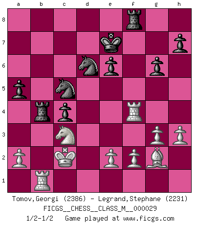 Last move : 1/2-1/2 2009 December 7 18:13:14 [Event "FICGS__CHESS__CLASS_M__000029"] [Site "FICGS"] [Date "2009.07.01"] [Round "1"] [White "Tomov,Georgi"] [Black "Legrand,Stephane"] [Result "1/2-1/2"] [WhiteElo "2386"] [BlackElo "2231"] 1.Nf3 c5 2.c4 Nc6 3.d4 cxd4 4.Nxd4 e6 5.g3 Nf6 6.Bg2 Qb6 7.Nb5 Ne5 8.N1c3 a6 9.Qa4 Rb8 10.Be3 Bc5 11.Bxc5 Qxc5 12.Qa3 b6 13.Nd6+ Ke7 14.Qxc5 bxc5 15.Nxc8+ Rhxc8 16.b3 d5 17.cxd5 c4 18.b4 Rxb4 19.h3 Ne8 20.Kd2 Nd6 21.Rab1 a5 22.Rhd1 Rcb8 23.Kc2 Nd7 24.dxe6 fxe6 25.Rd4 Nc5 26.Rg4 g6 27.Rd4 Rf8 28.Rf4 1/2-1/2 Reti Opening This chess game ended in a draw. Follow this game move after move (download)Only the player with the initiative has the right to attack. (Wilhelm Steinitz) Es ist im Leben wie im Schachspiel. Wir entwerfen einen Plan, dieser bleibt jedoch bedingt durch das, was im Schachspiel dem Gegner, im Leben dem Schicksal zu tun belieben wird. (Arthur Schopenhauer) Con el tiempo, empecé a progresar en partidas decisivas. Tal vez porque me di cuenta de una simple verdad: no solo estaba yo nervioso sino también mi oponente. (Mikhail Tal) Même un GMI sait rarement calculer sur plus de cinq coups une attaque à sacrifices. (Rudolf Spielmann) Luck never made a man wise. (Seneca, Letters to Lucilius)