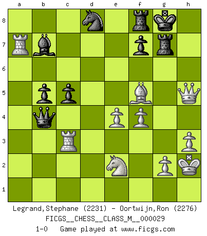 Last move : 1-0 2009 September 11 6:44:10 [Event "FICGS__CHESS__CLASS_M__000029"] [Site "FICGS"] [Date "2009.07.01"] [Round "1"] [White "Legrand,Stephane"] [Black "Oortwijn,Ron"] [Result "1-0"] [WhiteElo "2231"] [BlackElo "2276"] 1.d4 Nf6 2.c4 c6 3.Nf3 d5 4.Nc3 e6 5.Bg5 h6 6.Bh4 dxc4 7.e4 g5 8.Bg3 b5 9.Be2 Bb7 10.O-O Nbd7 11.Ne5 Bg7 12.Nxd7 Nxd7 13.Bd6 a6 14.a4 e5 15.Re1 Qf6 16.Ba3 Bf8 17.Bg4 Rd8 18.axb5 axb5 19.Bxf8 Nxf8 20.Ra7 h5 21.Bxh5 Rxd4 22.Qg4 Qe7 23.Rea1 Rd8 24.R1a6 Qc7 25.h3 Rd7 26.Qxg5 Ne6 27.Qf5 O-O 28.Bg4 Re8 29.Ra1 Rd6 30.Ne2 Qe7 31.Qxe5 Nd8 32.Qg3 Qe5 33.f4 Qxb2 34.Bd7 Rg6 35.Qf3 Rf8 36.Kh2 c5 37.Bf5 Rg7 38.R1a2 Qb3 39.Qh5 c3 40.R2a3 Qb4 41.Rxc3 1-0 Queen's pawn game Kingside Castling by player White (move 10) Kingside Castling by player Black (move 27) Player White won this chess game. Follow this game move after move (download)Methodical thinking is of more use in Chess than inspiration. (C. J. S. Purdy) Schach wird sich dank seiner hohen kulturellen Tradition immer durchsetzen. In näherer Zukunft womöglich sogar als Gegenreaktion auf die maßlose Reizüberflutung im Freizeit- und Spielbereich. (Garry Kasparov) El Ajedrez es tortura mental. (Garry Kasparov) Vouloir jouer aux échecs contre soi-même est aussi paradoxal que vouloir marcher sur son ombre. (Stefan Zweig) Whoever said the pen is mightier than the sword obviously never encountered automatic weapons. (US General Douglas MacArthur)