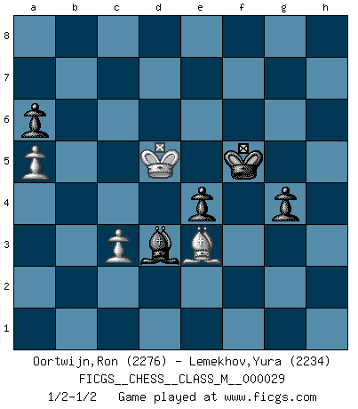 Last move : 1/2-1/2 2009 September 19 8:33:30 [Event "FICGS__CHESS__CLASS_M__000029"] [Site "FICGS"] [Date "2009.07.01"] [Round "1"] [White "Oortwijn,Ron"] [Black "Lemekhov,Yura"] [Result "1/2-1/2"] [WhiteElo "2276"] [BlackElo "2234"] 1.e4 c5 2.Nf3 d6 3.d4 cxd4 4.Nxd4 Nf6 5.Nc3 a6 6.Be3 e6 7.f3 b5 8.Qd2 Nbd7 9.O-O-O Bb7 10.a3 Rc8 11.g4 h6 12.h4 d5 13.Rg1 dxe4 14.g5 hxg5 15.hxg5 Nd5 16.Nxe4 Qb6 17.g6 f6 18.Bf2 b4 19.a4 Rh2 20.Rg2 Rxg2 21.Bxg2 b3 22.a5 Qc7 23.Nxb3 Bb4 24.c3 f5 25.Bg3 e5 26.Bh3 fxe4 27.fxe4 N5f6 28.Bh4 Bxc3 29.Bxd7+ Nxd7 30.bxc3 Bxe4 31.Kb2 Rb8 32.Ka2 Rxb3 33.Qxd7+ Qxd7 34.Rxd7 Kxd7 35.Kxb3 Bxg6 36.Kb4 Ke6 37.Kc5 Bd3 38.Bf2 g5 39.Bg1 Kf5 40.Kd5 e4 41.Be3 g4 1/2-1/2 Sicilian : Najdorf, Byrne (English) attack Queenside Castling by player White (move 9) 10 pieces endgame at move 35 : White KBPPP , Black KBPPP WHITE : King + 1 Bishop 3 Pawns BLACK : King + 1 Bishop 3 Pawns 9 pieces endgame at move 35 : White KBPP , Black KBPPP WHITE : King + 1 Bishop 2 Pawns BLACK : King + 1 Bishop 3 Pawns This chess game ended in a draw. Follow this game move after move (download)Chess is like life. (Boris Spassky) Schach ist ein Teil der Kultur, und wenn es mit der Kultur abwärts geht, geht es auch mit dem Schach abwärts. (Mikhail Moiseyevich Botvinik) Si el Ajedrez es una ciencia, es la mas inexacta. Si el Ajedrez es un arte, es demasiado inexacto para ser visto como tal. Si el Ajedrez es un deporte, es demasiado esotérico. Si el Ajedrez es un juego, es demasiado exigente para ser solo un juego. Si el Ajedrez es una aventura, es una muy demandante. Si el Ajedrez es una pasión, es una muy gratificante. Si el Ajedrez es la vida, es una muy triste. (Anónimo) A chaque perte on perd un peu de soi. (Joël Lautier) To err is human, but to really foul things up requires a computer. (Farmer's Almanac, 1978)