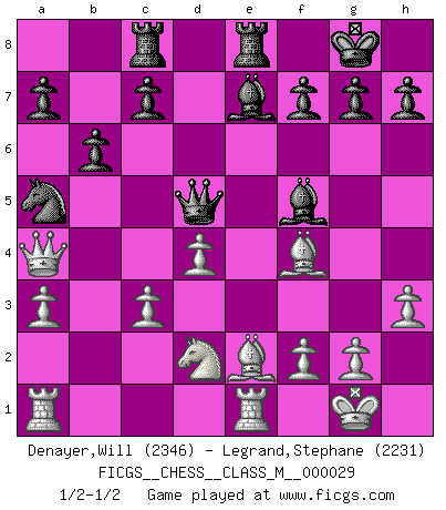 Last move : 1/2-1/2 2009 August 29 17:48:49 [Event "FICGS__CHESS__CLASS_M__000029"] [Site "FICGS"] [Date "2009.07.01"] [Round "1"] [White "Denayer,Will"] [Black "Legrand,Stephane"] [Result "1/2-1/2"] [WhiteElo "2346"] [BlackElo "2231"] 1.e4 e5 2.Nf3 Nf6 3.Nxe5 d6 4.Nf3 Nxe4 5.d4 d5 6.Bd3 Be7 7.O-O Nc6 8.c4 Nb4 9.Be2 Bf5 10.a3 Nc6 11.Nc3 Nxc3 12.bxc3 O-O 13.Re1 Re8 14.cxd5 Qxd5 15.Bf4 Rac8 16.h3 Be4 17.Be3 Na5 18.Nd2 Bf5 19.Qa4 b6 20.Bf4 1/2-1/2 Petrov : Classical attack Kingside Castling by player White (move 7) Kingside Castling by player Black (move 12) This chess game ended in a draw. Follow this game move after move (download)By this measure (on the gap between Fischer & his contemporaries), I consider him the greatest world champion. (Garry Kasparov) Das Blackmar-Diemer-Gambit verändert den ganzen Menschen! (Emil Joseph Diemer) Realmente no sabemos como el juego fue inventado, aunque hay sospechas. Tan pronto como descubramos a los culpables, se los haremos saber. (Bruce Pandolfini) En blitz, le Cavalier l'emporte sur le Fou. (Vlastimil Hort) Pushing plastic is for the many, pushing virtual pieces is for the fewer, pushing wood is for the very few. (Normajean Yates)