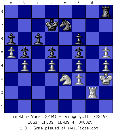 Last move : 1-0 2010 May 2 7:46:30 [Event "FICGS__CHESS__CLASS_M__000029"] [Site "FICGS"] [Date "2009.07.01"] [Round "1"] [White "Lemekhov,Yura"] [Black "Denayer,Will"] [Result "1-0"] [WhiteElo "2234"] [BlackElo "2346"] 1.d4 d5 2.c4 Nc6 3.Nf3 Bg4 4.Nc3 e6 5.cxd5 exd5 6.Qb3 Bxf3 7.exf3 Qe7+ 8.Be3 O-O-O 9.O-O-O Qe6 10.h4 Nge7 11.g3 Nf5 12.Bh3 Kb8 13.Kb1 Bb4 14.Ne2 Ba5 15.Qd3 g6 16.Nf4 Qd7 17.Ng2 Qe6 18.Bg5 f6 19.Bd2 Bxd2 20.Bxf5 gxf5 21.Qxd2 Rhe8 22.Qf4 Qd7 23.Ne3 Ne7 24.Rhe1 a6 25.Rc1 h5 26.b3 Rh8 27.Rc2 Rde8 28.Rec1 Rc8 29.Rc5 Rhd8 30.Kc2 Qe6 31.Kd2 Qd7 32.a4 Re8 33.Ra1 Ka7 34.b4 Kb8 35.Kd1 Red8 36.Ke1 b6 37.Rc2 Kb7 38.Kf1 Qd6 39.Qxd6 Rxd6 40.f4 Re6 41.a5 b5 42.Rc5 Rd8 43.Rac1 Rd7 44.R1c3 Re4 45.Nc2 Nc8 46.f3 Re6 47.Re3 Rxe3 48.Nxe3 Ne7 49.Kg2 Rd8 50.Kh3 c6 51.Rc2 Kc7 52.g4 Kd7 53.gxh5 Rh8 54.Rg2 1-0 QGD : Chigorin defense Queenside Castling by player Black (move 8) Queenside Castling by player White (move 9) Player White won this chess game. Follow this game move after move (download)Bobby just drops the pieces and they fall on the right squares. (Miguel Najdorf) Garry Kasparov war erst in der Großmeister-Organisation GMA, dann in der Profischach-Vereinigung PCA, zum Schluss kehrte er wieder in den Schoß der FIDE zurück. Aber gut, manche Leute sind flexibel (Viswanathan Anand) Las ideas audaces son como las piezas del Ajedrez que avanzan hacia adelante. Ellas pueden ser vencidas, pero también pueden iniciar una partida victoriosa. (Goethe) Je ne suis pas le dernier à jouer lâchement des coups douteux pendant le zeïtnot de l'adversaire pour l'achever: en effet les coups qui font le plus peur sont ceux que l'on ne comprend pas. Je me fais souvent peur quand je joue. (Un professeur anonyme) A shortcut is the longest distance between two points. (Don Groves)