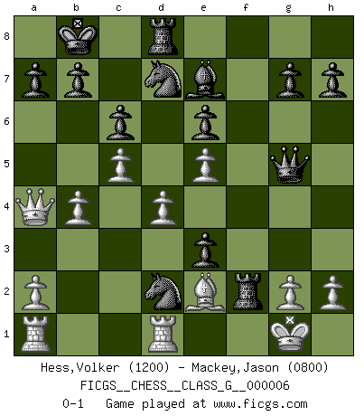 Last move : 0-1 2006 October 8 13:15:29 [Event "FICGS__CHESS__CLASS_G__000006"] [Site "FICGS"] [Date "2006.09.15"] [Round "1"] [White "Hess,Volker"] [Black "Mackey,Jason"] [Result "0-1"] [WhiteElo "1200"] [BlackElo "0800"] 1.e4 c6 2.d4 d5 3.Nc3 dxe4 4.Nxe4 Bf5 5.Qd3 Qd5 6.f3 e6 7.Be3 Nd7 8.Ne2 Bb4+ 9.c3 Be7 10.N2g3 Bg6 11.Be2 f5 12.Ng5 f4 13.c4 Qxg5 14.Qb3 O-O-O 15.Ne4 Bxe4 16.fxe4 fxe3 17.O-O Ngf6 18.e5 Ne4 19.Qa4 Kb8 20.c5 Nd2 21.Rfd1 Rhf8 22.b4 Rf2 0-1 Caro-Kann : Classical variation Queenside Castling by player Black (move 14) Kingside Castling by player White (move 17) Player Black won this chess game. Follow this game move after move (download)There's never before been a Chess player with such a thorough knowledge of the intricacies of the game and such an absolutely indomitable will to win. I think Bobby is the greatest player that ever lived. (Lisa Lane) Schach ist ein Kampf gegen den Fehler. (Johannes Herrman Zukertort) Un juego de Ajedrez es un dialogo, una conversación entre un jugador y su oponente. Cada movimiento del oponente puede contener amenazas o tropiezos, pero un jugador no se puede defender de las amenazas o tomar ventaja de los tropiezos si es que no se pregunta a sí mismo: ¿Que es lo que mi oponente va a hacer después de cada movida?. (Bruce A. Moon) Mais l'homme est une créature légère et illogique : semblable au joueur d'échecs, il n'aime que le processus du but à atteindre, non le but lui-même. (Dostoïevsky) Never risk one's whole fortune unless supported by one's entire army. (Niccolo Machiavelli)