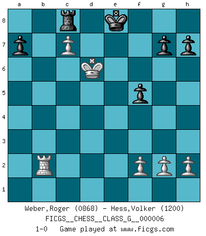 Last move : 1-0 2006 October 2 13:22:49 [Event "FICGS__CHESS__CLASS_G__000006"] [Site "FICGS"] [Date "2006.09.15"] [Round "1"] [White "Weber,Roger"] [Black "Hess,Volker"] [Result "1-0"] [WhiteElo "0868"] [BlackElo "1200"] 1.e4 e5 2.Nf3 Nc6 3.c3 Nf6 4.d3 Be7 5.Bg5 d5 6.Bxf6 Bxf6 7.exd5 Ne7 8.c4 O-O 9.Be2 c6 10.dxc6 Nxc6 11.O-O Nd4 12.Nc3 Be6 13.Ne4 Nxf3+ 14.Bxf3 Rc8 15.Nxf6+ Qxf6 16.Bxb7 Rb8 17.Qf3 Qxf3 18.Bxf3 Rxb2 19.a4 Rd2 20.Rad1 Rxd1 21.Bxd1 Rd8 22.Bc2 f5 23.Re1 Rb8 24.Rxe5 Rb2 25.Re2 Ra2 26.Rd2 Bd7 27.a5 Ba4 28.Kf1 Bxc2 29.Ke2 Bxd3+ 30.Kxd3 Rxa5 31.Kd4 Ra6 32.c5 Re6 33.Kd5 Re8 34.Rc2 Ra8 35.c6 Kf7 36.Kd6 Ke8 37.c7 Rc8 38.Rb2 1-0 Ponziani : Jaenisch counter-attack Kingside Castling by player Black (move 8) Kingside Castling by player White (move 11) Player White won this chess game. Follow this game move after move (download)Chess is life. (Bobby Fischer) Immer nach dem besten Zug zu suchen ist ziemlich unpraktisch. (Nigel Short) El Ajedrez tiene tanto misterio como las mujeres. (Purdy) Un millionnaire : 'Monsieur Steinitz ! Vous ne participez aux tournois que pour l'argent, alors que moi je n'y viens que pour l'honneur.' Steinitz : 'Chacun joue pour ce qu'il n'a pas'... There are two kinds of tragedy in this world, one is not getting what you want and the other is getting. (Lord of war)