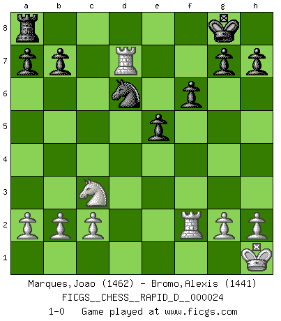 Last move : 1-0 2009 August 18 6:23:18 [Event "FICGS__CHESS__RAPID_D__000024"] [Site "FICGS"] [Date "2009.07.02"] [Round "1"] [White "Marques,Joao"] [Black "Bromo,Alexis"] [Result "1-0"] [WhiteElo "1462"] [BlackElo "1441"] 1.e4 c5 2.Nf3 Nc6 3.d4 cxd4 4.Nxd4 Nxd4 5.Qxd4 d6 6.Bb5+ Bd7 7.Bxd7+ Qxd7 8.O-O e5 9.Qd3 Nf6 10.Bg5 Be7 11.Nc3 O-O 12.Rad1 Rfd8 13.f4 exf4 14.Bxf4 Ne8 15.e5 dxe5 16.Qxd7 Rxd7 17.Rxd7 Bc5+ 18.Kh1 f6 19.Bg3 Nd6 20.Bf2 Bxf2 21.Rxf2 1-0 Sicilian defense Kingside Castling by player White (move 8) Kingside Castling by player Black (move 11) Player White won this chess game. Follow this game move after move (download)Fischer Chess play was always razor-sharp, rational and brilliant. One of the best ever. (Dave Regis) Es ist im Leben wie im Schachspiel. Wir entwerfen einen Plan, dieser bleibt jedoch bedingt durch das, was im Schachspiel dem Gegner, im Leben dem Schicksal zu tun belieben wird. (Arthur Schopenhauer) El juego de Damas es para vagabundos. (Paul Morphy) J'apprécie les joueurs d'est-indienne, c'est grâce à eux que je nourris ma famille depuis tant d'années. (Petrosian) I just play for fun. (Anna Kournikova)