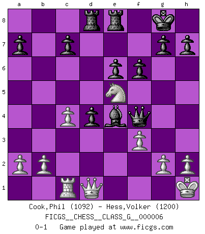 Last move : 0-1 2006 October 27 6:58:1 [Event "FICGS__CHESS__CLASS_G__000006"] [Site "FICGS"] [Date "2006.09.15"] [Round "1"] [White "Cook,Phil"] [Black "Hess,Volker"] [Result "0-1"] [WhiteElo "1092"] [BlackElo "1200"] 1.d4 e6 2.e4 Nf6 3.Bd3 d5 4.Bg5 dxe4 5.Bxe4 Be7 6.Bxf6 Bxf6 7.Nf3 O-O 8.O-O Nc6 9.Bxc6 bxc6 10.c3 Bb7 11.Nbd2 Re8 12.Ne4 c5 13.Nxf6+ Qxf6 14.Ne5 Qg5 15.f3 Rad8 16.Rc1 Qe3+ 17.Kh1 cxd4 18.Re1 Qf4 19.c4 f6 20.Re4 Bxe4 0-1 Queen's pawn Kingside Castling by player Black (move 7) Kingside Castling by player White (move 8) Player Black won this chess game. Follow this game move after move (download)What is the difference between chess and football? Everybody understands football, but nobody plays it. Everybody plays chess, but nobody understands it. Everything is relative. (Vladimir Kramnik) Um sich vor der Gefahr einer Erkältung zu schützen, sorge der wanderlustige König beizeiten für ein brauchbares Versteck. (Aaron Nimzowitsch) El hombre es un frívolo, una creatura engañosa y como un jugador de Ajedrez, se preocupa mas por el proceso de obtener su meta que de la meta por sí misma. (Dostoyevsky) J'ai vu le vaincu d'Echecs jouer des années durant dans l'espoir de la fête de la victoire. Car tu es plus riche de ce qu'elle existe si même elle n'est point pour toi. Ainsi de la perle du fond des mers. (Antoine de Saint-Exupéry) There are two major products that came out of Berkeley: LSD and UNIX. We do not believe this is to be a coincidence. (Jeremy S. Anderson)