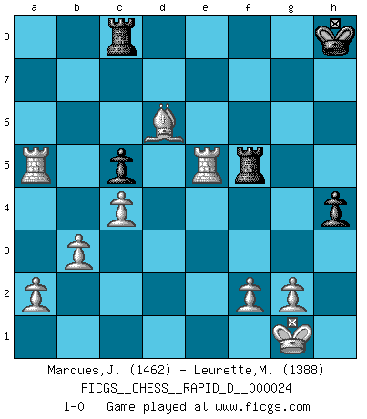 Last move : 1-0 2009 August 26 12:59:52 [Event "FICGS__CHESS__RAPID_D__000024"] [Site "FICGS"] [Date "2009.07.02"] [Round "1"] [White "Marques,Joao"] [Black "Leurette,Marc-Antoine"] [Result "1-0"] [WhiteElo "1462"] [BlackElo "1388"] 1.e4 e5 2.Nf3 Nc6 3.Bb5 Nf6 4.O-O Nxe4 5.Re1 Nd6 6.Bxc6 dxc6 7.Nxe5 Be7 8.d4 O-O 9.Nc3 b6 10.Nxc6 Qd7 11.Nxe7+ Kh8 12.Nxc8 Raxc8 13.Be3 Qf5 14.Ne2 Ne4 15.Ng3 Nxg3 16.hxg3 Rcd8 17.c3 h6 18.Qf3 Rd5 19.Qxf5 Rxf5 20.Bf4 Rb5 21.b3 c5 22.c4 Rb4 23.dxc5 bxc5 24.Bd6 Rc8 25.Re7 a5 26.Rxf7 Rb6 27.Be5 Rg6 28.Ra7 Rg5 29.Bf4 Rf5 30.Rxa5 g5 31.Bd6 h5 32.Re1 h4 33.gxh4 gxh4 34.Re5 1-0 Ruy Lopez : Berlin defense, Open variation Kingside Castling by player White (move 4) Kingside Castling by player Black (move 8) Player White won this chess game. Follow this game move after move (download)You have to have the fighting spirit. You have to force moves and take chances. (Bobby Fischer) Die unerbitterlichsten Regeln im Schach sind die Ausnahmen. (Savielly Grigorievitsch Tartakower) Si tu oponente no puede hacer nada activo, entonces no apures la posición; En vez de eso, dejalo estar sentado ahí, sufriendo y rogandote por un empate. (Jeremy Silman) Botvinnik disait en comparant les échecs à la musique: Il existe une science dont le but est l'étude de l'acoustique et des sons. Mais il y a aussi un art qui se sert de l'océan des sons : c'est la musique. De toute évidence, il en est de même pour la pensée. La logique est l'étude des lois de la réflexion et les échecs reflètent, en tant qu'art, le côté logique de la réflexion, sous la forme d'images artistiques... Extrait de Fischer - Spassky, Reykjavik 1972 par Alexander & F. Wyndham (Ed. Solar), p 37. Programmer - an organism that turns coffee into software. (Anonymous)