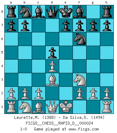 Last move : 1-0 2009 August 6 0:27:1 [Event "FICGS__CHESS__RAPID_D__000024"] [Site "FICGS"] [Date "2009.07.02"] [Round "1"] [White "Leurette,Marc-Antoine"] [Black "Da Silva,David"] [Result "1-0"] [WhiteElo "1388"] [BlackElo "1494"] 1.e4 c6 2.Nf3 d5 3.exd5 cxd5 4.d4 Nf6 5.Bd3 1-0 This chess game has been lost on time (started : 2009.07.02 10:8:7) Caro-Kann defense Player White won this chess game. Follow this game move after move (download)My style is somewhere between that of Tal and Petrosian. (Reshevsky) Alle Schachspieler sollten auch ein Hobby haben. (Savielly Grigorievitsch Tartakower) Me siento como si fuera una pieza en una partida de Ajedrez, cuando mi oponente me indica: esa pieza no puede ser movida. (Soren Kierkegaard) Mon pion favori sur ma case favorite ! Bronstein en parlant d'un coup de pion en h5 quand il avait les Noirs. The Internet is so big, so powerful and pointless that for some people it is a complete substitute for life. (Andrew Brown)
