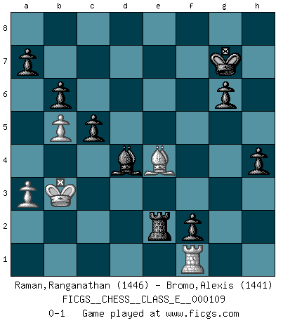 Last move : 0-1 2010 January 12 8:43:23 [Event "FICGS__CHESS__CLASS_E__000109"] [Site "FICGS"] [Date "2009.07.03"] [Round "1"] [White "Raman,Ranganathan"] [Black "Bromo,Alexis"] [Result "0-1"] [WhiteElo "1446"] [BlackElo "1441"] 1.c4 e5 2.e4 c5 3.Nc3 Nf6 4.Be2 g6 5.Qa4 Nc6 6.Nf3 d6 7.d3 Bg7 8.a3 Bd7 9.h3 Nd4 10.Nb5 Bxb5 11.cxb5 b6 12.Nxd4 exd4 13.Bf4 O-O 14.Qc4 Re8 15.O-O-O d5 16.Qc2 dxe4 17.dxe4 Nxe4 18.Bg3 Bh6+ 19.Kb1 Nxg3 20.fxg3 Qc7 21.Qd3 Re3 22.Qc4 Rae8 23.Bd3 Rxg3 24.Rhg1 Be3 25.Rde1 Qd7 26.Rgf1 Rxg2 27.Bc2 Rh2 28.Bb3 Rf2 29.h4 Rxf1 30.Rxf1 Re7 31.Qd3 Kg7 32.Bc4 Qh3 33.Qb3 f5 34.Ka2 Qxh4 35.Bg8 d3 36.Bc4 d2 37.Rd1 f4 38.Qc3+ Qf6 39.Qd3 f3 40.Qd5 Re8 41.Qd7+ Re7 42.Qd5 Re8 43.Rf1 f2 44.Bb3 Rd8 45.Qc4 d1Q 46.Bxd1 Rd2 47.Bc2 h5 48.Kb1 h4 49.Ka2 Bd4 50.Kb3 Bxb2 51.Ka2 Qc3 52.Qxc3+ Bxc3 53.Kb3 Bd4 54.Be4 Re2 0-1 This chess game has been lost on time (started : 2009.07.03 3:28:21) English Opening Kingside Castling by player Black (move 13) Queenside Castling by player White (move 15) Promotion Queen by player Black (move 45) Player Black won this chess game. Follow this game move after move (download)Chess is no whit inferior to the violin, and we have a large number of professional violinists. (Mikhail Botvinnik) Im Reiche der Wirklichkeit ist man nie so glücklich wie im Reiche der Gedanken. (Arthur Schopenhauer) ¿Se han dado cuenta de que Fischer casi nunca ha tenido piezas malas? El las intercambia y las piezas malas se quedan con sus oponenets. (Yuri Balashov) Le thème de l'attaque double intervient d'une manière ou d'une autre dans l'immense majorité des combinaisons. (Youri Averbakh) Imagination is more important than knowledge. Knowledge is limited. Imagination encircles the world. (Albert Einstein)
