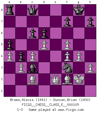 Last move : 1-0 2009 December 7 21:26:12 [Event "FICGS__CHESS__CLASS_E__000109"] [Site "FICGS"] [Date "2009.07.03"] [Round "1"] [White "Bromo,Alexis"] [Black "Duncan,Brian"] [Result "1-0"] [WhiteElo "1441"] [BlackElo "1400"] 1.e4 e5 2.Nf3 Nf6 3.Nxe5 d6 4.Nf3 Nc6 5.Bb5 Bd7 6.Nc3 Be7 7.h3 O-O 8.O-O a6 9.Ba4 b5 10.Bb3 Qc8 11.Re1 Re8 12.d4 b4 13.Nd5 a5 14.c4 Bf8 15.Nxf6+ gxf6 16.d5 Ne7 17.a4 Ng6 18.Bc2 Bg7 19.b3 Ne5 20.Nh4 f5 21.f4 Ng6 22.Nxf5 Bxf5 23.exf5 Nh4 24.g4 Bxa1 25.Be3 Bc3 26.Re2 c6 27.Bf2 Nf3+ 28.Kg2 Rxe2 29.Qxe2 1-0 This chess game has been lost on time (started : 2009.07.03 3:28:21) Petrov's defense Kingside Castling by player Black (move 7) Kingside Castling by player White (move 8) Player White won this chess game. Follow this game move after move (download)Not only will I predict his triumph over Botvinnik, but I'll go further and say that he'll probably be the greatest Chess player that ever lived. (John Collins) Kann Schach nicht schließlich das Nationalspiel der Deutschen werden? Und welche weiteren Ausblicke bieten sich dann dar! Welche Hebung des allgemeinen Kultur-Niveaus, ja der Moral, wenn das Schachbrett den Kartentisch verdrängen würde! Wahrlich, ein Ziel, des Schweißes der Edlen wert! (Siegbert Tarrasch) No es una movida, aún la mejor movida que tu debas buscar, sino un plan comprensible. (Eugene Znosko-Borovsky) Il s'avisa de me proposer d'apprendre les échecs qu'il jouait un peu... me voilà forcené des échecs. J'achète un échiquier, je m'enferme dans ma chambre, j'y passe des jours et des nuits à vouloir apprendre par cur toutes les parties. (Jean-Jacques Rousseau, Confessions) Programming can only do so much before it becomes too much. (Don Groves)
