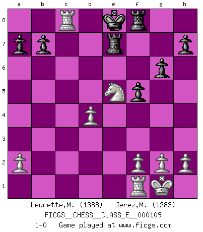 Last move : 1-0 2009 August 21 9:26:26 [Event "FICGS__CHESS__CLASS_E__000109"] [Site "FICGS"] [Date "2009.07.03"] [Round "1"] [White "Leurette,Marc-Antoine"] [Black "Jerez,Miriam"] [Result "1-0"] [WhiteElo "1388"] [BlackElo "1283"] 1.e4 e5 2.Nf3 Nc6 3.d4 d5 4.exd5 Na5 5.dxe5 Bc5 6.Bd2 Bb6 7.Nc3 Bf5 8.Bd3 Bxd3 9.cxd3 Ne7 10.Qa4+ Qd7 11.Qxd7+ Kxd7 12.O-O f5 13.Ng5 g6 14.e6+ Ke8 15.Nf7 Rf8 16.Ne5 Rd8 17.b4 Nxd5 18.bxa5 Bxa5 19.Rac1 Nxc3 20.Bxc3 Bxc3 21.Rxc3 Rd6 22.Rxc7 Rxe6 23.d4 Re7 24.Rc8+ 1-0 Scotch Opening Kingside Castling by player White (move 12) Player White won this chess game. Follow this game move after move (download)You may learn much more from a game you lose than from a game you win. You will have to lose hundreds of games before becoming a good player. (Jose Raul Capablanca) Mit Schach schule ich mein Gefühl für Geometrie, was für Tennis und Schach gleichermaßen wichtig ist. (Boris Becker) Vive, pierde y aprende al observar a tu oponente como ganar. (Amber Steenbock) Même un GMI sait rarement calculer sur plus de cinq coups une attaque à sacrifices. (Rudolf Spielmann) There is a great deal of difference between an eager man who wants to read a book and a tired man who wants a book to read. (G.K. Chesterton)