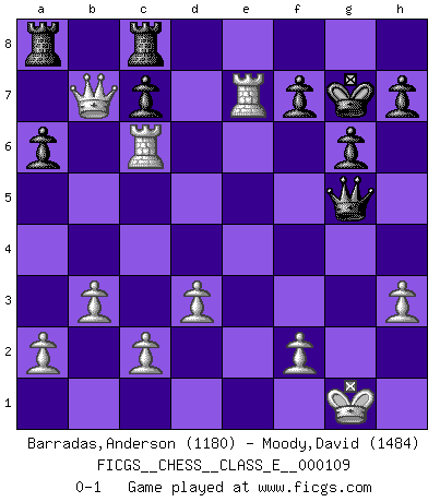 Last move : 0-1 2009 July 5 17:31:23 [Event "FICGS__CHESS__CLASS_E__000109"] [Site "FICGS"] [Date "2009.07.03"] [Round "1"] [White "Barradas,Anderson"] [Black "Moody,David"] [Result "0-1"] [WhiteElo "1180"] [BlackElo "1484"] 1.e4 e5 2.Nf3 Nc6 3.Bb5 a6 4.Ba4 Nf6 5.O-O Be7 6.Bxc6 dxc6 7.Nxe5 Nxe4 8.Nf3 Bg4 9.d3 Ng5 10.Bxg5 Bxg5 11.Re1+ Kf8 12.Nbd2 Qf6 13.h3 Bxd2 14.Qxd2 Bxf3 15.gxf3 Qxf3 16.Re3 Qf6 17.Qb4+ Kg8 18.Rae1 g6 19.Qxb7 Kg7 20.b3 Qd6 21.Re7 Rhc8 22.R1e6 Qf4 23.Rxc6 Qg5+ 0-1 Ruy Lopez : Exchange variation doubly deferred (DERLD) Kingside Castling by player White (move 5) Player Black won this chess game. Follow this game move after move (download)Winning isn't everything... but losing is nothing. (Mednis) Das ganze Leben mit einer Ehefrau ist wie ein Endspiel mit ungleichfarbigen Läufern. (Viktor Kortschnoi) La belleza de un movimiento no se refleja solo en su apariencia, sino en el pensamiento detrás de él. (Siegbert Tarrasch) Il (Jacob Murray) ne joue pas pour le bon coup, mais pour le meilleur. (Eloi Relange) To be champion requires more than simply being a strong player; one has to be a strong human being as well. (Anatoly Karpov)