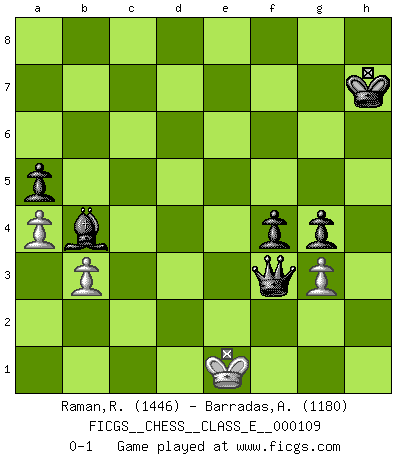 Last move : 0-1 2009 July 8 22:39:18 [Event "FICGS__CHESS__CLASS_E__000109"] [Site "FICGS"] [Date "2009.07.03"] [Round "1"] [White "Raman,Ranganathan"] [Black "Barradas,Anderson"] [Result "0-1"] [WhiteElo "1446"] [BlackElo "1180"] 1.c4 Nf6 2.Nc3 g6 3.e4 e5 4.d4 d6 5.Bg5 Bg7 6.h3 O-O 7.Qd2 h6 8.Bh4 Nbd7 9.Rd1 c6 10.Be2 g5 11.Bg3 b5 12.cxb5 cxb5 13.Bxb5 Re8 14.Bc6 Rb8 15.b3 exd4 16.Nb5 Nxe4 17.Bxe4 Rxb5 18.Qe2 Ba6 19.Bxd6 Rb6 20.Qf3 Rxd6 21.Ne2 Bxe2 22.Qxe2 Nc5 23.f3 Nxe4 24.fxe4 d3 25.Qe3 f5 26.Kf1 Rxe4 27.Qd2 Re2 28.Qb4 a5 29.Qc4+ Kh7 30.Rxd3 Rxd3 31.Kxe2 Rd2+ 32.Ke3 f4+ 33.Kf3 Rd3+ 34.Kg4 Rg3+ 35.Kf5 Qf6+ 36.Ke4 Re3+ 37.Kd5 Qe5+ 38.Kc6 Rc3 39.Rc1 Rxc4+ 40.Rxc4 Qe8+ 41.Kc5 Bf8+ 42.Kd4 Qd7+ 43.Ke4 Qe6+ 44.Kf3 h5 45.Re4 Qf5 46.a4 g4+ 47.hxg4 hxg4+ 48.Kf2 Qxe4 49.g3 Bc5+ 50.Kf1 Qf3+ 51.Ke1 Bb4+ 0-1 English Opening Kingside Castling by player Black (move 6) 10 pieces endgame at move 48 : White KPPP , Black KQBPPP WHITE : King + 3 Pawns BLACK : King + 1 Queen 1 Bishop 3 Pawns Player Black won this chess game. Follow this game move after move (download)Is Bobby Fischer quite sane ? (Salo Flohr) Irgendwie scheint mir sonntags früh um 9 Uhr der Killerinstinkt verloren gegangen zu sein. (Alexej Shirov) No hay precio que no valga la pena por la cabellera del Rey enemigo. (Koblentz) Un millionnaire : 'Monsieur Steinitz ! Vous ne participez aux tournois que pour l'argent, alors que moi je n'y viens que pour l'honneur.' Steinitz : 'Chacun joue pour ce qu'il n'a pas'... If you are going through hell, keep going. (Winston Churchill)