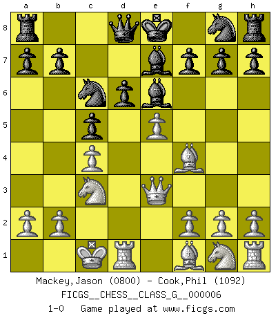 Last move : 1-0 2006 September 29 12:17:23 [Event "FICGS__CHESS__CLASS_G__000006"] [Site "FICGS"] [Date "2006.09.15"] [Round "1"] [White "Mackey,Jason"] [Black "Cook,Phil"] [Result "1-0"] [WhiteElo "0800"] [BlackElo "1092"] 1.c4 c6 2.e4 e5 3.d4 exd4 4.Qxd4 d6 5.Nc3 Be6 6.Bf4 c5 7.Qe3 Be7 8.O-O-O Nc6 9.e5 1-0 English : Caro-Kann defensive system Queenside Castling by player White (move 8) Player White won this chess game. Follow this game move after move (download)You can only get good at Chess if you love the game. (Bobby Fischer) Schach ist ein Reich, wo sich die menschliche Phantasie frei entfalten kann. (David Bronstein) La última cosa en que Fischer estaba interesado era en tonterías, siempre y cuando el Ajedrez estuviera involucrado. (Elie Agur) Même si vous avez un bon coup à faire, regardez toujours s'il n'y en a pas un qui lui soit préférable. (Pedro Damiano) If things go wrong, don't go with them. (Roger Babson)