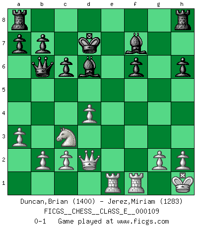 Last move : 0-1 2009 November 11 8:34:56 [Event "FICGS__CHESS__CLASS_E__000109"] [Site "FICGS"] [Date "2009.07.03"] [Round "1"] [White "Duncan,Brian"] [Black "Jerez,Miriam"] [Result "0-1"] [WhiteElo "1400"] [BlackElo "1283"] 1.d4 d5 2.e4 dxe4 3.Nc3 Nf6 4.f3 Bf5 5.Bc4 exf3 6.Nxf3 e6 7.O-O c6 8.Bf4 Bd6 9.Bg5 Nbd7 10.a3 Qb6 11.Bb3 e5 12.Kh1 e4 13.Bxf6 Nxf6 14.Ng5 Bg4 15.Qd2 Bh5 16.Rae1 h6 17.Ngxe4 Kd7 18.Nxf6+ gxf6 19.Bxf7 Bxf7 0-1 This chess game has been lost on time (started : 2009.07.03 3:28:21) Blackmar gambit Kingside Castling by player White (move 7) Player Black won this chess game. Follow this game move after move (download)I like the moment when I break a man's ego. (Bobby Fischer) Das Schachspiel hat wie die Liebe, die Musik, die Fähigkeit, den Menschen glücklich zu machen. Ich habe ein leises Gefühl des Bedauerns für jeden, der das Schachspiel nicht kennt, so wie ich jeden bedaure, der die Liebe nicht kennt. (Siegbert Tarrasch) Ser exitoso en el Ajedrez te permite descubrir tu propia personalidad. Eso es lo que deseo para los niños de mi clase. (Saudin Robovic) Tous ces prétendus hommes politiques sont les pions, les Cavaliers, les Tours ou les Fous d'une partie d'échecs qui se jouera tant qu'un hasard ne renversera pas l'échiquier. (Honoré de Balzac) A specialist learns more and more about less and less until he knows everything about nothing. (Nicholas Murray Butler)