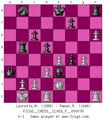 Last move : 0-1 2009 August 22 11:53:31 [Event "FICGS__CHESS__CLASS_F__000078"] [Site "FICGS"] [Date "2009.07.03"] [Round "1"] [White "Leurette,Marc-Antoine"] [Black "Raman,Ranganathan"] [Result "0-1"] [WhiteElo "1388"] [BlackElo "1446"] 1.e4 e5 2.Nf3 Bd6 3.Bc4 Nf6 4.Nc3 h6 5.d3 c6 6.Be3 Ng4 7.Qd2 b5 8.Bb3 Qe7 9.O-O-O a5 10.h3 Nxe3 11.Qxe3 a4 12.Bxa4 bxa4 13.a3 Ra6 14.g4 g5 15.Nb1 Bc7 16.Nfd2 Bb6 17.Qe2 Bc5 18.h4 d6 19.hxg5 Be6 20.f4 Ba2 21.gxh6 Rb6 22.Nc3 d5 23.Nxa4 Rb5 24.Nc3 Rb7 25.Ndb1 Bxb1 26.Nxb1 exf4 27.Nc3 Be3+ 28.Kb1 Qxa3 29.Nb5 Rxb5 0-1 King's knight Opening Queenside Castling by player White (move 9) Player Black won this chess game. Follow this game move after move (download)We must make sure that Chess will not be like a dead language, very interesting, but for a very small group. (Sytze Faber) Den Ruhm habe ich schon, jetzt brauche ich noch das Geld. (Wilhelm Steinitz) No hay otro maestro que tenga una voluntad terrífica de ganar. Al tablero, el irradía peligro y aún los oponentes mas fuertes tienden a congelarse como liebres cuando olfatean a una pantera. Aún sus debilidades son peligrosas. Con las blancas, su juego de apertura es predecible - te es posible hacer planes en su contra - pero es tan fuerte que tus planes casi nunca funcionan. En el juego medio, su precisión e invención son fabulosas y en finales, tú simplemente no le puedes vencer. (Experto Alemán anónimo) Votre seul travail dans les ouvertures est d'obtenir un milieu de partie jouable. (Lajos Portish) An expert is a man who has made all the mistakes which can be made in a very narrow field. (Niels Bohr)