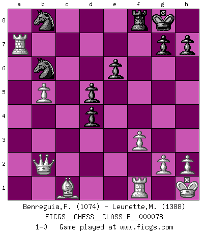 Last move : 1-0 2009 July 16 13:38:21 [Event "FICGS__CHESS__CLASS_F__000078"] [Site "FICGS"] [Date "2009.07.03"] [Round "1"] [White "Benreguia,Frederic"] [Black "Leurette,Marc-Antoine"] [Result "1-0"] [WhiteElo "1074"] [BlackElo "1388"] 1.Nf3 Nf6 2.d4 d5 3.a3 e6 4.b4 Be7 5.e3 b6 6.Be2 O-O 7.O-O c6 8.c3 b5 9.Ne5 a5 10.Qd2 axb4 11.cxb4 Ne4 12.Qb2 Ba6 13.Bd3 Nd7 14.Nxc6 Nb8 15.Nxd8 Bxd8 16.f3 Nf6 17.e4 Bb6 18.e5 Nfd7 19.a4 bxa4 20.Bxa6 Rxa6 21.Kh1 f6 22.b5 Ra7 23.Nc3 fxe5 24.Nxa4 exd4 25.Nxb6 Nxb6 26.Rxa7 1-0 Reti Opening Kingside Castling by player Black (move 6) Kingside Castling by player White (move 7) Player White won this chess game. Follow this game move after move (download)It is the aim of the modern school, not to treat every position according to one general law, but according to the principle inherent in the position. (Richard Reti) Wer sich die Fähigkeit anerziehen will im Schach selbstständig zu denken, der muß alles meiden, was leblos ist: ausgeklügelte Theorien, die sich auf sehr wenige Beispiele und eine Menge Hirngespinste stützen. (Emanuel Lasker) Los asuntos humanos son como una partida de Ajedrez: solo aquellos que no lo toman seriamente, pueden ser llamados buenos jugadores. (Hung Tzu Ch'eng) Il s'avisa de me proposer d'apprendre les échecs qu'il jouait un peu... me voilà forcené des échecs. J'achète un échiquier, je m'enferme dans ma chambre, j'y passe des jours et des nuits à vouloir apprendre par cur toutes les parties. (Jean-Jacques Rousseau, Confessions) Happy endings are just stories that haven't finished yet. (Jane Smith in Mr & Mrs Smith)