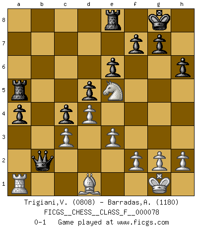 Last move : 0-1 2009 July 20 15:55:57 [Event "FICGS__CHESS__CLASS_F__000078"] [Site "FICGS"] [Date "2009.07.03"] [Round "1"] [White "Trigiani,Vincenzo"] [Black "Barradas,Anderson"] [Result "0-1"] [WhiteElo "0808"] [BlackElo "1180"] 1.d4 d5 2.Nc3 Nf6 3.Bf4 e6 4.Nb5 Na6 5.Qd2 Bb4 6.c3 Ba5 7.Qe3 O-O 8.Qd3 h6 9.e3 c6 10.b4 Bc7 11.Bxc7 Nxc7 12.Nxc7 Qxc7 13.Be2 a6 14.Nf3 Re8 15.O-O b5 16.a3 a5 17.bxa5 Rxa5 18.Bd1 c5 19.a4 c4 20.Qd2 Bd7 21.Ne5 Ne4 22.Bc2 bxa4 23.Nxd7 Nxd2 24.Rfd1 Nb3 25.Ne5 Nxa1 26.Rxa1 Qb7 27.Bd1 Qb2 0-1 Queen's pawn : Chigorin variation Kingside Castling by player Black (move 7) Kingside Castling by player White (move 15) Player Black won this chess game. Follow this game move after move (download)There are tough players and nice guys, and I'm a tough player. (Bobby Fischer) Es genügt nicht ein guter Spieler zu sein, man muß auch gut spielen. (Siegbert Tarrasch) El Ajedrez es un invernadero donde los frutos del carácter pueden madurar mas completamente que en la vida. (Edward Morgan Foster) Les échecs, c'est la lutte contre l'erreur. (Johannes Zukertort) Life is verb, not a noun. (Charlotte Perkins Gilman)