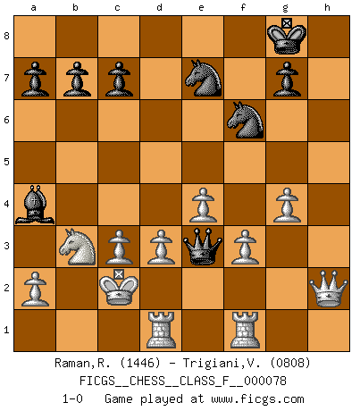 Last move : 1-0 2009 August 11 18:4:51 [Event "FICGS__CHESS__CLASS_F__000078"] [Site "FICGS"] [Date "2009.07.03"] [Round "1"] [White "Raman,Ranganathan"] [Black "Trigiani,Vincenzo"] [Result "1-0"] [WhiteElo "1446"] [BlackElo "0808"] 1.e4 e5 2.c3 Nf6 3.Qf3 Bc5 4.b4 Ke7 5.bxc5 Re8 6.Ba3 Kf8 7.Bd3 Nc6 8.Nh3 d6 9.Qg3 Be6 10.Ng5 Bd7 11.f3 Kg8 12.Bc4 dxc5 13.Bxc5 Na5 14.Bxf7+ Kh8 15.Bxe8 Qxe8 16.d3 Qg6 17.Qxe5 h6 18.h4 hxg5 19.hxg5 Kg8 20.Nd2 Nc6 21.Qh2 Qxg5 22.O-O-O Re8 23.Kc2 Re7 24.Bxe7 Nxe7 25.Rdg1 Ba4+ 26.Nb3 Qe3 27.Rd1 Qb6 28.g4 Qe3 29.Rhf1 1-0 Variation Lopez Opening : Lopez Opening Queenside Castling by player White (move 22) Player White won this chess game. Follow this game move after move (download)We cannot resist the fascination of sacrifice, since a passion for sacrifices is part of a Chessplayer's nature. (Rudolf Spielman) Wer nie einen Fehler gemacht hat, hat nie etwas Neues ausprobiert. (Albert Einstein) El Ajedrez es un juego de pelea el cual es puramente intelectual e incluye la suerte. (Richard Reti) Le pion, dans sa simplicité, marche droit devant lui, mais lorsqu'il prend, il le fait obliquement? Ainsi l'homme, tant qu'il reste pauvre, marche dans la droiture et vit honnêtement, mais lorsqu'il recherche les honneurs, il flatte, se parjure et, par les voies obliques, cherche une position supérieure sur l'échiquier du monde. (Jean de Galles) Good decisions come from experience, and experience comes from bad decisions. (Anonymous)