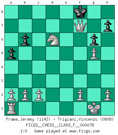 Last move : 1-0 2009 August 26 6:33:25 [Event "FICGS__CHESS__CLASS_F__000078"] [Site "FICGS"] [Date "2009.07.03"] [Round "1"] [White "Frame,Jeremy"] [Black "Trigiani,Vincenzo"] [Result "1-0"] [WhiteElo "1142"] [BlackElo "0808"] 1.e4 e5 2.Nf3 Nf6 3.Nxe5 Bc5 4.d4 O-O 5.dxc5 Nxe4 6.Bc4 Nxc5 7.Qf3 Qe7 8.Bf4 Nc6 9.O-O Nxe5 10.Re1 Nxc4 11.Rxe7 d6 12.Nc3 Bf5 13.Bxd6 cxd6 14.Qxf5 Nd2 15.Nd5 g6 16.Qg5 Rae8 17.Rxe8 Rxe8 18.Nf6+ Kg7 19.Nxe8+ Kf8 20.Nxd6 b6 21.Qxd2 Kg7 22.g4 Ne4 23.Qd4+ Nf6 24.g5 a5 25.Qxf6+ Kf8 26.Qxf7+ 1-0 Petrov's defense Kingside Castling by player Black (move 4) Kingside Castling by player White (move 9) Player White won this chess game. Follow this game move after move (download)I know people who have all the will in the world, but still can't play good Chess. (Bobby Fischer) Obwohl ich alt bin, darf mir niemand den Finger in den Mund stecken, sonst beisse ich. (Wilhelm Steinitz) Bendita sea la memoria de aquel que dio al mundo este juego inmortal. (A. G. Gardiner) Toutes choses étant égales, c'est la conviction qui gagne. Alliée à une volonté de vaincre, elle sert de détonateur, suscite des idées, disperse les doutes et aide à penser clairement. (Robert Fischer) There will be no order, only chaos. (Sol Robeson in Pi by Darren Aronofsky)