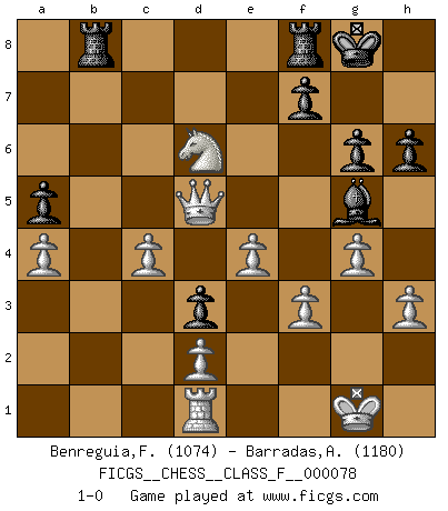 Last move : 1-0 2009 July 6 0:45:40 [Event "FICGS__CHESS__CLASS_F__000078"] [Site "FICGS"] [Date "2009.07.03"] [Round "1"] [White "Benreguia,Frederic"] [Black "Barradas,Anderson"] [Result "1-0"] [WhiteElo "1074"] [BlackElo "1180"] 1.e4 e5 2.Nf3 Nf6 3.Bd3 d6 4.Qe2 Bg4 5.O-O a6 6.b3 Be7 7.Qe3 Bxf3 8.Qxf3 O-O 9.c4 c5 10.Nc3 Nc6 11.Qd1 Qa5 12.a3 Bd8 13.g4 h6 14.f3 Nd4 15.h3 b5 16.Bb2 b4 17.axb4 Qxb4 18.Ra3 a5 19.Bc2 Nxc2 20.Qxc2 g6 21.Nb5 Ne8 22.Ra4 Qxa4 23.bxa4 Nc7 24.Nxd6 Ne6 25.Bxe5 Nd4 26.Bxd4 cxd4 27.Qb2 d3 28.Qb7 Bg5 29.Rd1 Rab8 30.Qd5 1-0 Petrov's defense Kingside Castling by player White (move 5) Kingside Castling by player Black (move 8) Player White won this chess game. Follow this game move after move (download)Morphy was probably the greatest genius of them all. (Bobby Fischer) Gewöhnliche Menschen denken nur daran, wie sie ihre Zeit verbringen. Ein intelligenter Mensch versucht, sie auszunutzen. (Arthur Schopenhauer) Siempre es mejor sacrificar los hombres de tu oponente. (Savielly Tartakower) Le jeu d'échecs fait naître et fortifie en nous plusieurs qualités précieuses dans le cours de l'existence, telles que la prévoyance, la circonspection, la prudence, et la persévérance. (Benjamin Franklin - 1783, la morale des échecs) Life is the sum of all your choices. (Albert Camus)