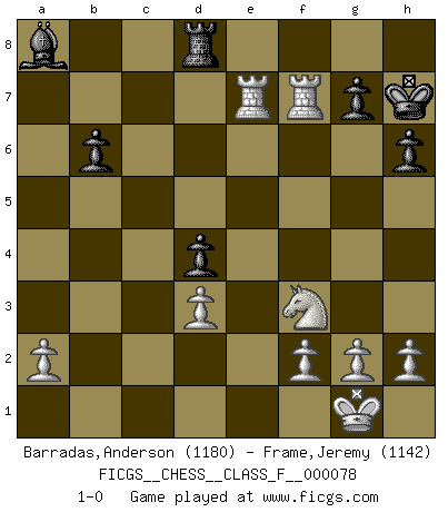 Last move : 1-0 2009 July 5 2:48:2 [Event "FICGS__CHESS__CLASS_F__000078"] [Site "FICGS"] [Date "2009.07.03"] [Round "1"] [White "Barradas,Anderson"] [Black "Frame,Jeremy"] [Result "1-0"] [WhiteElo "1180"] [BlackElo "1142"] 1.e4 e5 2.Nf3 Nf6 3.Nxe5 d6 4.Nf3 Nxe4 5.Qe2 Qe7 6.d3 Nf6 7.Bg5 Qxe2+ 8.Bxe2 Be7 9.Nc3 O-O 10.Bxf6 Bxf6 11.Nd5 Bxb2 12.Rb1 Ba3 13.Nxc7 b6 14.Nxa8 Na6 15.O-O Bb7 16.Rb3 Bc5 17.d4 Bxa8 18.dxc5 Nxc5 19.Re3 Rd8 20.Re7 d5 21.Re1 a6 22.Bxa6 h6 23.Bd3 Nxd3 24.cxd3 Kh7 25.Rxf7 d4 26.R1e7 1-0 Petrov : Cozio (Lasker) attack Kingside Castling by player Black (move 9) Kingside Castling by player White (move 15) Player White won this chess game. Follow this game move after move (download)Those who say they understand Chess, understand nothing. (Robert Hubner) Im Schach gibt es keinen Platz für Galanterie. (Irving Chernev) Aquellos que dicen entender al Ajedrez, no entienden nada. (Robert Hubner) J'ai vu le vaincu d'Echecs jouer des années durant dans l'espoir de la fête de la victoire. Car tu es plus riche de ce qu'elle existe si même elle n'est point pour toi. Ainsi de la perle du fond des mers. (Antoine de Saint-Exupéry) Humor is by far the most significant activity of the human brain. (Edward De Bono)