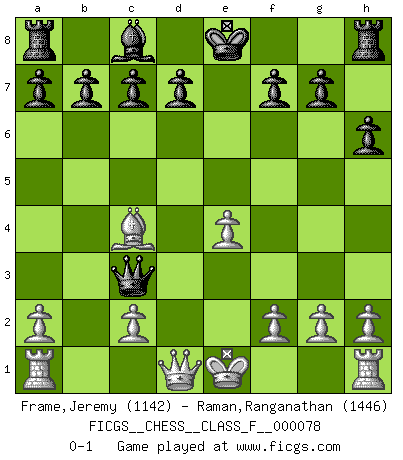 Last move : 0-1 2009 July 4 2:44:30 [Event "FICGS__CHESS__CLASS_F__000078"] [Site "FICGS"] [Date "2009.07.03"] [Round "1"] [White "Frame,Jeremy"] [Black "Raman,Ranganathan"] [Result "0-1"] [WhiteElo "1142"] [BlackElo "1446"] 1.e4 e5 2.Nf3 Bd6 3.d4 Nc6 4.dxe5 Nxe5 5.Nxe5 Bxe5 6.Bc4 Nf6 7.Bg5 h6 8.Bxf6 Qxf6 9.Nc3 Bxc3+ 10.bxc3 Qxc3+ 0-1 King's knight Opening Player Black won this chess game. Follow this game move after move (download)The most powerful weapon in Chess is to have the next move. (David Bronstein) Ich bin es gewohnt, das die Jugend mir überhaupt keinen Respekt entgegenbringt. (Alexander Morozewich) ¡Examina movidas que hagan daño! Un buen ojo for movidas desvastantes es mucho mas importante que el conocimiento de principios estratégicos. (Purdy) Même si vous avez un bon coup à faire, regardez toujours s'il n'y en a pas un qui lui soit préférable. (Pedro Damiano) Drag your thoughts away from your troubles... by the ears, by the heels, or any other way you can manage it. (Mark Twain)