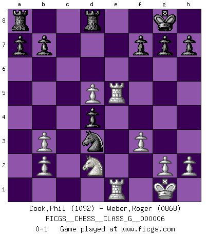 Last move : 0-1 2006 October 31 11:4:50 [Event "FICGS__CHESS__CLASS_G__000006"] [Site "FICGS"] [Date "2006.09.15"] [Round "1"] [White "Cook,Phil"] [Black "Weber,Roger"] [Result "0-1"] [WhiteElo "1092"] [BlackElo "0868"] 1.Nf3 d5 2.e3 c5 3.c4 d4 4.exd4 cxd4 5.d3 Nc6 6.Bd2 e5 7.Be2 Qb6 8.Qb3 Qxb3 9.axb3 Bb4 10.O-O Bg4 11.Re1 Bxf3 12.Bxf3 Nge7 13.Bd5 O-O 14.f3 Nxd5 15.cxd5 Bxd2 16.Nxd2 Nb4 17.Rxe5 Rfd8 18.Rae1 Nxd3 0-1 Reti Opening Kingside Castling by player White (move 10) Kingside Castling by player Black (move 13) Player Black won this chess game. Follow this game move after move (download)Some sacrifices are sound; the rest are mine. (Mikhail Tal) Im Hotelzimmer gab es nur zwei Schaben. (Über die Turnierbedingungen) (Peter Swidler) La señal de un Gran Maestro es su habilidad de ganar una partida rápidamente y sin dolor. (Irving Chernev) Les ravages du H expliquent la différence de niveau entre Tal et Thal [Abergel]. Everybody lies. (Gregory House, House M.D.)