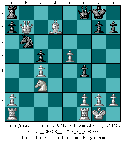 Last move : 1-0 2009 July 8 15:49:47 [Event "FICGS__CHESS__CLASS_F__000078"] [Site "FICGS"] [Date "2009.07.03"] [Round "1"] [White "Benreguia,Frederic"] [Black "Frame,Jeremy"] [Result "1-0"] [WhiteElo "1074"] [BlackElo "1142"] 1.b4 e5 2.e4 Bxb4 3.c3 Ba5 4.Ba3 d6 5.d3 Bb6 6.Nf3 c6 7.Be2 Bc7 8.O-O Be6 9.c4 f5 10.Nc3 f4 11.d4 exd4 12.Qxd4 Nf6 13.Ng5 O-O 14.Nxe6 Qe7 15.Nxc7 Qxc7 16.Bxd6 Qf7 17.e5 Nfd7 18.Bxf8 Qxf8 19.Bg4 c5 20.Qe4 Nb6 21.Qxb7 N8d7 22.Bxd7 1-0 Polish (Sokolsky) opening Kingside Castling by player White (move 8) Kingside Castling by player Black (move 13) Player White won this chess game. Follow this game move after move (download)The passed pawn is a criminal, who should be kept under lock and key. Mild measures, such as police surveillance, are not sufficient. (Nimzovitch) Ich verachte Kasparow. (Viktor Kortschnoi) Los tropiezos estan todos ahí en el tablero, esperando que se cometan. (Savielly Tartakover) Mon pion favori sur ma case favorite ! Bronstein en parlant d'un coup de pion en h5 quand il avait les Noirs. I'm extremely disappointed. I send you out for exciting, new designer drugs, you come back with tomato sauce. (Gregory House, House M.D.)