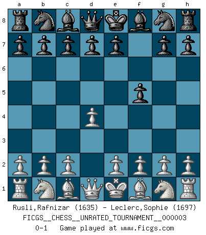 Last move : 0-1 2009 July 7 14:55:25 [Event "FICGS__CHESS__UNRATED_TOURNAMENT__000003"] [Site "FICGS"] [Date "2009.07.03"] [Round "1"] [White "Rusli,Rafnizar"] [Black "Leclerc,Sophie"] [Result "0-1"] [WhiteElo "1635"] [BlackElo "1697"] 1.d4 f5 0-1 Dutch Player Black won this chess game. Follow this game move after move (download)Chess problems demand from the composer the same virtues that characterize all worthwhile art: originality, invention, conciseness, harmony, complexity, and splendid insincerity. (Vladimir Nabokov) Fallen sollten polizeilich verboten werden. (Savielly Grigorievitsch Tartakower) El Ajedrez es un juego de pelea el cual es puramente intelectual e incluye la suerte. (Richard Reti) Ne tendez aucun piège pour le plaisir ! Ne jouez rien dans l'espoir que l'adversaire réagisse de façon stupide ! Prenez toujours pour acquis que l'adversaire va trouver le meilleur coup ! Ne jouez jamais de coup dans l'espoir que l'adversaire ne voie pas la menace ! Chacun de vos coups doit améliorer la position d'une façon ou d'une autre. The beginning is the most important part of the work. (Plato)