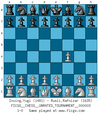 Last move : 1-0 2009 July 9 11:33:44 [Event "FICGS__CHESS__UNRATED_TOURNAMENT__000003"] [Site "FICGS"] [Date "2009.07.03"] [Round "1"] [White "Inving,Yugi"] [Black "Rusli,Rafnizar"] [Result "1-0"] [WhiteElo "1481"] [BlackElo "1635"] 1.f4 1-0 Bird's Opening Player White won this chess game. Follow this game move after move (download)Half the variations which are calculated in a tournament game turn out to be completely superfluous. Unfortunately, no one knows in advance which half. (Jan Tinman) Drei Punkte vor allen anderen ist wie einer, der im weißen Anzug posiert, während der Rest in Müllsäcke gekleidet dasteht. (Viktor Kortschnoi) En el Ajedrez, tal como es jugado por los Maestros, practicamente la suerte es eliminada. (Emanuel Lasker) Pour moi, les échecs ne sont pas un jeu mais un art. (Alexandre Alekhine) A woman without a man is like a fish without a bicycle. (Gloria Steinem)