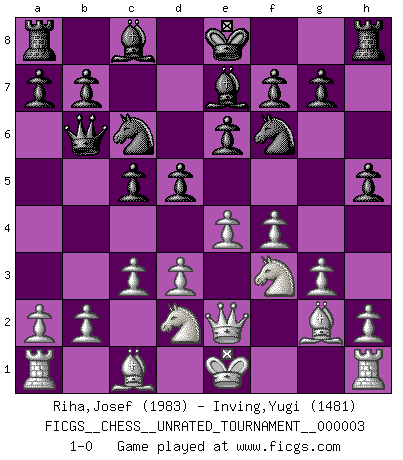 Last move : 1-0 2009 August 10 6:29:56 [Event "FICGS__CHESS__UNRATED_TOURNAMENT__000003"] [Site "FICGS"] [Date "2009.07.03"] [Round "1"] [White "Riha,Josef"] [Black "Inving,Yugi"] [Result "1-0"] [WhiteElo "1983"] [BlackElo "1481"] 1.e4 c5 2.d3 Nc6 3.f4 d5 4.Nf3 e6 5.Qe2 Be7 6.g3 Qb6 7.c3 h5 8.Bg2 Nf6 9.Nbd2 1-0 Sicilian defense Player White won this chess game. Follow this game move after move (download)When you absolutely don't know what to do anymore, it is time to panic. (John van der Wiel) Versuche, dich von der Sklaverei der Eröffnungsvarianten zu befreien. Stattdessen soll man gewisse Typenpositionen erlernen, die man eingehend analysiert. (Aaron Nimzowitsch) El jugador táctico sabe que hacer cuando hay algo que hacer; mientras que el estratega sabe que hacer cuando no hay nada que hacer. (Gerald Abrahams) Il n'y a plus de joueurs du niveau de Jacob Murray dont la seule quête est le beau jeu, le plaisir de voir les pièces construire quelque chose. Sur 10 idées à la minute, 9 seront sans intérêt, la dernière s'avèrera géniale. (Christian Bauer) Fortune favours the audacious. (Desiderius Erasmus)