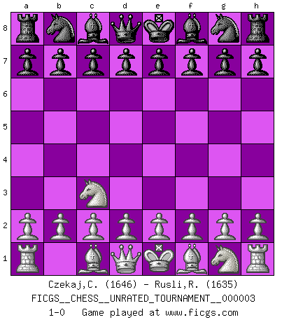 Last move : 1-0 2009 July 7 14:56:49 [Event "FICGS__CHESS__UNRATED_TOURNAMENT__000003"] [Site "FICGS"] [Date "2009.07.03"] [Round "1"] [White "Czekaj,Christophe"] [Black "Rusli,Rafnizar"] [Result "1-0"] [WhiteElo "1646"] [BlackElo "1635"] 1.Nc3 1-0 Dunst (Sleipner, Heinrichsen) Opening Player White won this chess game. Follow this game move after move (download)Chess is the art which expresses the science of logic. (Mikhail Botvinnik) Ich glaube nicht an Psychologie, ich glaube an gute Züge. (Robert James Fischer) A través de las casillas del tablero, los Indios explican el movimiento del tiempo y la edad, las influencias mas altas que controlan el mundo y los lazos que vinculan al Ajedrez con el alma humana. (Al-Masudi) La menace est plus forte que l'exécution. (Aaron Nimzovitch) If I had no sense of humor, I would long ago have committed suicide. (Mahatma Gandhi)