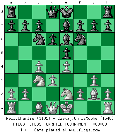 Last move : 1-0 2009 September 2 21:54:41 [Event "FICGS__CHESS__UNRATED_TOURNAMENT__000003"] [Site "FICGS"] [Date "2009.07.03"] [Round "1"] [White "Neil,Charlie"] [Black "Czekaj,Christophe"] [Result "1-0"] [WhiteElo "1102"] [BlackElo "1646"] 1.c4 d6 2.g3 e5 3.Bg2 Nc6 4.Nc3 Nf6 5.d3 Be6 6.e4 Be7 7.Nge2 1-0 This chess game has been lost on time (started : 2009.07.03 9:16:5) English Opening Player White won this chess game. Follow this game move after move (download)Chess is imagination. (David Bronstein) Fischer: 'Remis!?' Uhlmann: 'Aber es muss doch dreimal Zugwiederholung sein!' Fischer: 'Sie nehmen das Remis an, wie ich es sage, sonst spiele ich weiter und werde Sie dann schlagen!' (Robert James Fischer) Las leyes del Ajedrez no permiten una libre elección: tienes que mover quieras o no. (Emanuel Lasker) Avant la finale, les dieux ont créé le milieu de partie. (Tarrasch) You lose, general Kenobi. (General Grievous in Star Wars ep.3)