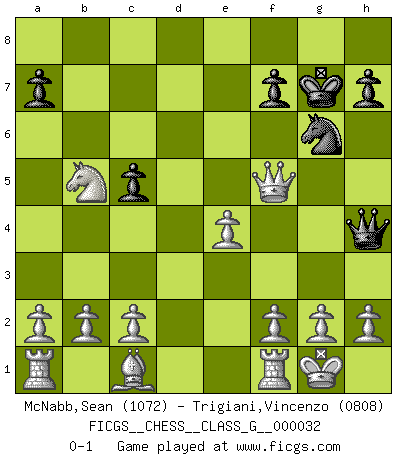 Last move : 0-1 2009 October 13 21:3:30 [Event "FICGS__CHESS__CLASS_G__000032"] [Site "FICGS"] [Date "2009.07.03"] [Round "1"] [White "McNabb,Sean"] [Black "Trigiani,Vincenzo"] [Result "0-1"] [WhiteElo "1072"] [BlackElo "0808"] 1.e4 e5 2.Nf3 Bc5 3.d4 exd4 4.Nxd4 Bxd4 5.Qxd4 d6 6.Bb5+ c6 7.Bc4 Qh4 8.O-O c5 9.Bb5+ Bd7 10.Bxd7+ Kxd7 11.Qxg7 Nc6 12.Qxh8 Nge7 13.Qxa8 d5 14.Qxb7+ Kd6 15.Nc3 Ng6 16.Nb5+ Ke6 17.Qxc6+ Ke5 18.Qxd5+ Kf6 19.Qf5+ Kg7 0-1 This chess game has been lost on time (started : 2009.07.03 17:9:25) King's knight Opening Kingside Castling by player White (move 8) Player Black won this chess game. Follow this game move after move (download)Only the player with the initiative has the right to attack. (Wilhelm Steinitz) Es ist im Leben wie im Schachspiel. Wir entwerfen einen Plan, dieser bleibt jedoch bedingt durch das, was im Schachspiel dem Gegner, im Leben dem Schicksal zu tun belieben wird. (Arthur Schopenhauer) Tu sabes que vas a perder. Aún cuando tenía la ventaja, yo sabía que iba a perder. - al estar jugando con Fischer (Andrew Soltis) Celui qui prend des risques peut perdre, celui qui n'en prend pas perd toujours. (Xavier Tartacover) Programmer - an organism that turns coffee into software. (Anonymous)
