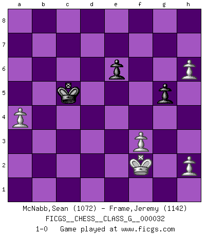 Last move : 1-0 2009 August 9 18:29:58 [Event "FICGS__CHESS__CLASS_G__000032"] [Site "FICGS"] [Date "2009.07.03"] [Round "1"] [White "McNabb,Sean"] [Black "Frame,Jeremy"] [Result "1-0"] [WhiteElo "1072"] [BlackElo "1142"] 1.e4 e5 2.Nf3 Nf6 3.Nc3 Nc6 4.Bc4 Bc5 5.O-O d6 6.d3 Be6 7.Nd5 Bxd5 8.exd5 Ne7 9.d4 exd4 10.Nxd4 c6 11.dxc6 Nxc6 12.Nxc6 bxc6 13.Re1+ Kd7 14.Bf4 d5 15.Bd3 Re8 16.Bf5+ Re6 17.Bxe6+ fxe6 18.Qe2 Ne4 19.Be3 Bxe3 20.Qxe3 c5 21.c3 Rb8 22.b4 cxb4 23.Qxa7+ Qc7 24.Qxc7+ Kxc7 25.cxb4 Rxb4 26.Rec1+ Rc4 27.Rxc4+ dxc4 28.Rc1 c3 29.f3 Nc5 30.Rxc3 Kc6 31.a4 Kb6 32.Rc4 g5 33.Kf2 h5 34.g4 Kc6 35.gxh5 Kd5 36.Rxc5+ Kxc5 37.h6 1-0 Petrov Three knights game Kingside Castling by player White (move 5) 10 pieces endgame at move 35 : White KRPPPP , Black KNPP WHITE : King + 1 Rook 4 Pawns BLACK : King + 1 Knight 2 Pawns 9 pieces endgame at move 36 : White KRPPPP , Black KPP WHITE : King + 1 Rook 4 Pawns BLACK : King + 2 Pawns 8 pieces endgame at move 36 : White KPPPP , Black KPP WHITE : King + 4 Pawns BLACK : King + 2 Pawns Player White won this chess game. Follow this game move after move (download)Examine moves that smite! A good eye for smites is far more important than a knowledge of strategical principles. (Purdy) Privat ist Kortschnoi kein schlechter Mensch, sehr sympathisch. Aber während des Spiels ist er grausam. Er will dich töten. (Miguel Najdorf) EL Ajedrez es como la vida. (Boris Spassky) J'ai toujours senti une vague pitié pour l'homme qui ne connaît rien aux échecs, tout comme j'en aurais pour un homme ignorant de l'amour. Les Echecs, comme la musique ou comme l'amour, ont le pouvoir de rendre heureux. (Siegbert Tarrasch) Cactus - It is depressed cucumber. (Ilmars Cirulis)
