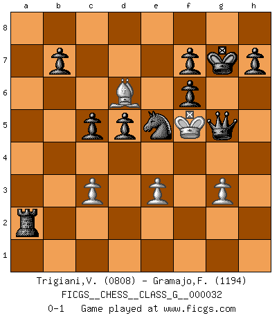 Last move : 0-1 2009 September 8 8:10:14 [Event "FICGS__CHESS__CLASS_G__000032"] [Site "FICGS"] [Date "2009.07.03"] [Round "1"] [White "Trigiani,Vincenzo"] [Black "Gramajo,Francisco"] [Result "0-1"] [WhiteElo "0808"] [BlackElo "1194"] 1.d4 d5 2.Bf4 Nc6 3.Nc3 Nf6 4.Nb5 e5 5.dxe5 a6 6.exf6 axb5 7.Nf3 gxf6 8.e3 Bg4 9.Nh4 Bxd1 10.Kxd1 Bg7 11.Bxb5 O-O 12.Nf5 Ne5 13.Re1 c6 14.Ba4 Rxa4 15.Re2 c5 16.Ke1 Qa5+ 17.Kf1 Rxa2 18.Rb1 Ra1 19.R2e1 Rxb1 20.Rxb1 Qa2 21.Re1 Qxb2 22.g3 Nf3 23.Bd6 Ra8 24.Nxg7 Qb5+ 25.Kg2 Nxe1+ 26.Kg1 Kxg7 27.Bf4 Nf3+ 28.Kg2 Qe2 29.c3 Ra2 30.Bd6 Qxf2+ 31.Kh3 Qxh2+ 32.Kg4 Ne5+ 33.Kf4 Qh6+ 34.Kf5 Qg5+ 0-1 Queen's pawn, Mason variation Kingside Castling by player Black (move 11) Player Black won this chess game. Follow this game move after move (download)No price is too great for the scalp of the enemy King. (Koblentz) Ich habe Putins Aufstieg an die Macht beobachtet und seine Politik, die demokratischen Institutionen meines Landes zu zerstören. (Garry Kasparov) Juega la Apertura como un libro, el Juego Medio como un mago y los Finales como una máquina. (Spielmann) Le jeu d'échecs fait naître et fortifie en nous plusieurs qualités précieuses dans le cours de l'existence, telles que la prévoyance, la circonspection, la prudence, et la persévérance. (Benjamin Franklin - 1783, la morale des échecs) Do you know these so called Volunteers don't even get paid! (Simpsons)