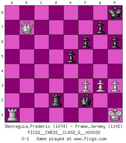 Last move : 0-1 2009 August 5 1:37:31 [Event "FICGS__CHESS__CLASS_G__000032"] [Site "FICGS"] [Date "2009.07.03"] [Round "1"] [White "Benreguia,Frederic"] [Black "Frame,Jeremy"] [Result "0-1"] [WhiteElo "1074"] [BlackElo "1142"] 1.b4 e5 2.a3 d6 3.e4 Be7 4.Nf3 Nf6 5.d3 O-O 6.Nc3 Bg4 7.Be2 Nc6 8.O-O Bxf3 9.Bxf3 Nd4 10.a4 Nxf3+ 11.Qxf3 c6 12.Rd1 Rc8 13.a5 d5 14.Bg5 h6 15.Bxf6 Bxf6 16.exd5 cxd5 17.Nxd5 Qd6 18.c4 Be7 19.c5 f6 20.Nxe7+ Qxe7 21.a6 bxa6 22.Qd5+ Kh8 23.Rxa6 Rfd8 24.Qa2 Rd4 25.Rxa7 Qe8 26.Qb2 Rcd8 27.Qc3 Qb5 28.Rda1 Rxd3 29.Qe1 Qxb4 30.c6 Qb6 31.g3 Qxc6 32.h3 Qb6 33.Qe4 Rd1+ 34.Kg2 Rxa1 35.Rxa1 Qd4 36.Qb1 Qd5+ 37.f3 Qd2+ 38.Kh1 Qf2 39.Qb7 Rd2 0-1 Polish (Sokolsky) opening Kingside Castling by player Black (move 5) Kingside Castling by player White (move 8) Player Black won this chess game. Follow this game move after move (download)When the Chess game is over, the Pawn and the King go back to the same box. (Irish saying) Frage: Gibt es etwas was Sie mehr lieben als Autobahnen ohne Tempobegrenzungen? - Antwort: Deutsche Frauen ohne Tempobegrenzungen. (Loek van Wely) Aunque la mayoría de la gente disfruta observar las partidas de los grandes Maestros de ataque, algunos de los jugadores mas notables en la historia han sido los jugadores silenciosos posicionales. Lentamente ellos te aplastan despojandote de tu espacio, congestionando tus piezas y dejandote virtualmente sin nada que hacer. (Yasser Seirawan) Les erreurs sont comme les malheurs, elles n'arrivent jamais seules. (Siegbert Tarrasch) Political correctness is subjecting us to gross incompetence. (Johann Piek)