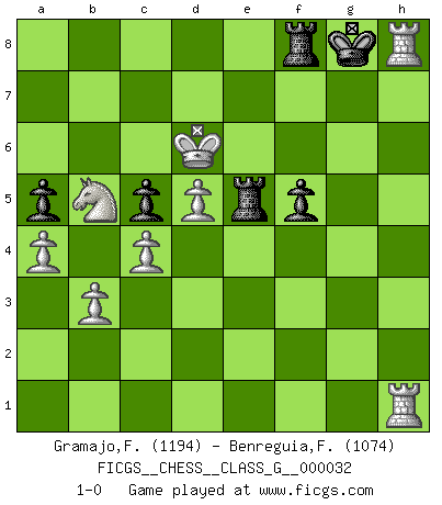 Last move : 1-0 2009 July 31 23:53:44 [Event "FICGS__CHESS__CLASS_G__000032"] [Site "FICGS"] [Date "2009.07.03"] [Round "1"] [White "Gramajo,Francisco"] [Black "Benreguia,Frederic"] [Result "1-0"] [WhiteElo "1194"] [BlackElo "1074"] 1.e4 e5 2.Nf3 d6 3.h3 Nf6 4.Bc4 Nxe4 5.O-O d5 6.Bd3 Qf6 7.Bxe4 c6 8.Bd3 Bd6 9.c4 e4 10.Qe2 O-O 11.Bxe4 dxe4 12.Qxe4 a5 13.g4 Bd7 14.d4 b6 15.Bg5 Qe6 16.Qd3 f6 17.Be3 Ra6 18.Nc3 c5 19.d5 Qe8 20.Rae1 Qf7 21.Nh4 g5 22.Nf5 Bxf5 23.gxf5 Nd7 24.Nb5 Ne5 25.Qe2 Qd7 26.a4 Qxf5 27.Nxd6 Qxh3 28.f4 gxf4 29.Rxf4 Qg3+ 30.Qg2 Qxg2+ 31.Kxg2 Nd3 32.Rg4+ Kh8 33.Rb1 Ne5 34.Rh4 b5 35.Nxb5 Rg8+ 36.Kf2 Ng4+ 37.Kf3 Nxe3 38.Rbh1 Rg7 39.Kxe3 Ra8 40.Kf4 Re8 41.Kf5 Rf8 42.b3 Rg5+ 43.Ke6 Re5+ 44.Kd6 f5 45.Rxh7+ Kg8 46.Rh8+ 1-0 Philidor's defense Kingside Castling by player White (move 5) Kingside Castling by player Black (move 10) Player White won this chess game. Follow this game move after move (download)You can only get good at Chess if you love the game. (Bobby Fischer) Die Leute spielen gegen mich seit 15 Jahren unter Ihren Möglichkeiten. (Robert James Fischer) Si no le temes a Spassky, entonces elimino el elemento del dinero. (Jim Slater) Même si vous avez un bon coup à faire, regardez toujours s'il n'y en a pas un qui lui soit préférable. (Pedro Damiano) History is the quarrels of popes and kings, with wars or pestilences in every page; the men all so good for nothing, and hardly any women at all. (Jane Austen)