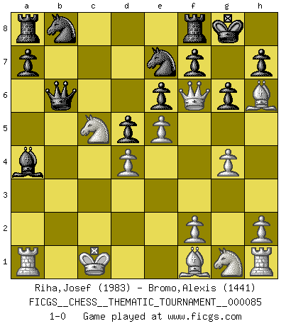 Last move : 1-0 2009 July 16 6:37:45 [Event "FICGS__CHESS__THEMATIC_TOURNAMENT__000085"] [Site "FICGS"] [Date "2009.07.05"] [Round "1"] [White "Riha,Josef"] [Black "Bromo,Alexis"] [Result "1-0"] [WhiteElo "1983"] [BlackElo "1441"] 1.e4 e6 2.d4 d5 3.Nc3 Bb4 4.e5 c5 5.a3 Ba5 6.b4 cxb4 7.Nb5 Ne7 8.axb4 Bxb4+ 9.c3 Ba5 10.Nd6+ Kf8 11.Qh5 Bxc3+ 12.Kd1 g6 13.Qf3 Nf5 14.Qxc3 Bd7 15.Nxb7 Qb6 16.Nc5 Kg7 17.g4 Ne7 18.Qf3 Rf8 19.Qf6+ Kg8 20.Bh6 Ba4+ 21.Kc1 1-0 French : Winawer, Advance, 5.a3 Player White won this chess game. Follow this game move after move (download)There are two types of sacrifices: correct ones and mine. (Mikhail Tal) Gegen einen Schachcomputer zu verlieren ist wie Löcher in den Strümpfen zuhaben. Es ist nicht peinlich, solange man der einzige ist der es weiß. (Anonymous) La única cosa que los jugadores de Ajedrez tienen en común, es el Ajedrez. (Lodewijk Prins) 'L'échange des dames est un coup dur pour les deux adversaires...' Un journaliste lors d'une partie du match Spassky-Fischer Empty your mind, be formless, shapeless — like water. (Bruce Lee)