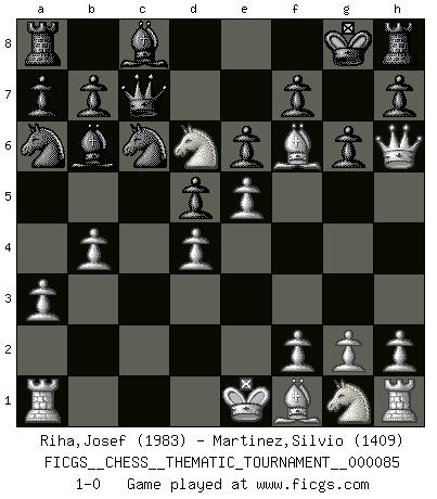 Last move : 1-0 2009 July 16 2:49:33 [Event "FICGS__CHESS__THEMATIC_TOURNAMENT__000085"] [Site "FICGS"] [Date "2009.07.05"] [Round "1"] [White "Riha,Josef"] [Black "Martinez,Silvio"] [Result "1-0"] [WhiteElo "1983"] [BlackElo "1409"] 1.e4 e6 2.d4 d5 3.Nc3 Bb4 4.e5 c5 5.a3 Ba5 6.b4 cxb4 7.Nb5 b3 8.Bd2 Na6 9.cxb3 Ne7 10.Nd6+ Kf8 11.b4 Bb6 12.Qh5 g6 13.Qh4 Nc6 14.Bg5 Qc7 15.Qh6+ Kg8 16.Bf6 1-0 French : Winawer, Advance, 5.a3 Player White won this chess game. Follow this game move after move (download)All I want to do, ever, is just play Chess. (Bobby Fischer) Je mehr ich von der FIDE weiss, um so weniger verstehe ich. (Alexander Kalifman) Juega la Apertura como un libro, el Juego Medio como un mago y los Finales como una máquina. (Spielmann) Toute estimation doit être constamment réévaluée. (Jacob Estrin) In theory there is no difference between theory and practice. In practice there is. (Yogi Berra)