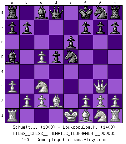 Last move : 1-0 2009 September 28 22:5:41 [Event "FICGS__CHESS__THEMATIC_TOURNAMENT__000085"] [Site "FICGS"] [Date "2009.07.05"] [Round "1"] [White "Schuett,Wilhelm"] [Black "Loukopoulos,Klearchos"] [Result "1-0"] [WhiteElo "1800"] [BlackElo "1400"] 1.e4 e6 2.d4 d5 3.Nc3 Bb4 4.e5 c5 5.a3 Ba5 6.Bd2 Nc6 7.Qg4 Kf8 8.dxc5 Nxe5 9.Qg3 1-0 French : Winawer, Advance, 5.a3 Player White won this chess game. Follow this game move after move (download)A passed Pawn increases in strength as the number of pieces on the board diminishes. (Capablanca) Jeder Schachmeister war einmal ein Anfänger. (Irving Chernev) Cuando la partida de Ajedrez termina, el Peón y el Rey regresan a la misma caja. (Irish saying) Aucun coup ne doit être joué sans but. (Pedro Damiano) Some people are so afraid to die that they never begin to live. (Henry Van Dyke)