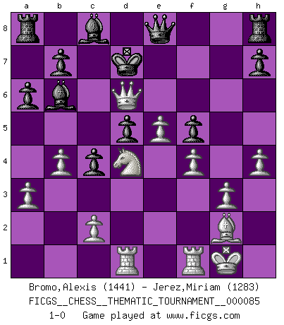 Last move : 1-0 2009 August 18 4:25:0 [Event "FICGS__CHESS__THEMATIC_TOURNAMENT__000085"] [Site "FICGS"] [Date "2009.07.05"] [Round "1"] [White "Bromo,Alexis"] [Black "Jerez,Miriam"] [Result "1-0"] [WhiteElo "1441"] [BlackElo "1283"] 1.e4 e6 2.d4 d5 3.Nc3 Bb4 4.e5 c5 5.a3 Ba5 6.Nge2 c4 7.g3 Nc6 8.Bg2 Nh6 9.Bxh6 gxh6 10.b4 Bb6 11.O-O h5 12.h4 f5 13.f4 Nxd4 14.Nxd4 a6 15.Qxh5+ Ke7 16.Rad1 Qe8 17.Qg5+ Kd7 18.Qg7+ Kd8 19.Qf6+ Kd7 20.Nxd5 exd5 21.Qd6+ 1-0 French : Winawer, Advance, 5.a3 Kingside Castling by player White (move 11) Player White won this chess game. Follow this game move after move (download)Castle early and often. (Rob Sillars) Wenn man heute mit 14 Jahren noch kein GM ist, kann man es vergessen. (Viswanathan Anand) Te sientas frente a un tablero y repentinamente tu corazón brinca. Tu mano tiembla al tomar una pieza y moverla. Pero lo que el Ajedrez te enseña es que tu debes permanecer ahí con calma y pensar de que si realmente es una buena idea o de que si hay otras ideas mejores. (Stanley Kubrick) RxDa4 pat (...) Wisdom is the reward you get for a lifetime of listening when you'd have preferred to talk. (Doug Larson)