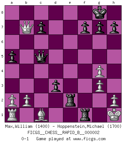 Last move : 0-1 2006 April 26 20:49:17 [Event "FICGS__CHESS__RAPID_B__000002"] [Site "FICGS"] [Date "2006.04.19"] [Round "1"] [White "Max,William"] [Black "Hoppenstein,Michael"] [Result "0-1"] [WhiteElo "1400"] [BlackElo "1700"] 1.c4 e5 2.g3 Nc6 3.Bg2 Nf6 4.Nc3 Bb4 5.Nd5 O-O 6.Nxb4 Nxb4 7.Nf3 e4 8.Nd4 d5 9.cxd5 Qxd5 10.Nc2 a5 11.O-O Qh5 12.Ne3 Ng4 13.Nxg4 Bxg4 14.Re1 Rfe8 15.f3 Qc5+ 16.d4 exd3 17.Kh1 Nc2 18.fxg4 Nxe1 19.Qxe1 Rxe2 20.Qf1 Rae8 21.Qf3 Re1+ 22.Bf1 R8e2 23.Qxb7 Rxf1+ 0-1 English Opening Kingside Castling by player Black (move 5) Kingside Castling by player White (move 11) Player Black won this chess game. Follow this game move after move (download)In the perfect Chess combination as in a first-rate short story, the whole plot and counter-plot should lead up to a striking finale, the interest not being allayed until the very last moment. (Yates and Winter) Garry Kasparov war erst in der Großmeister-Organisation GMA, dann in der Profischach-Vereinigung PCA, zum Schluss kehrte er wieder in den Schoß der FIDE zurück. Aber gut, manche Leute sind flexibel (Viswanathan Anand) De todos mis libros Rusos, la defensa contiene y difunde el 'calor' mas grande que pudiese verse extraño al observar lo supremamente abstracto que el Ajedrez supuestamente es. (Vladimir Nabokov) RxDa4 pat (...) You think that education is too expensive ? Try ignorance. (Derek Bok)