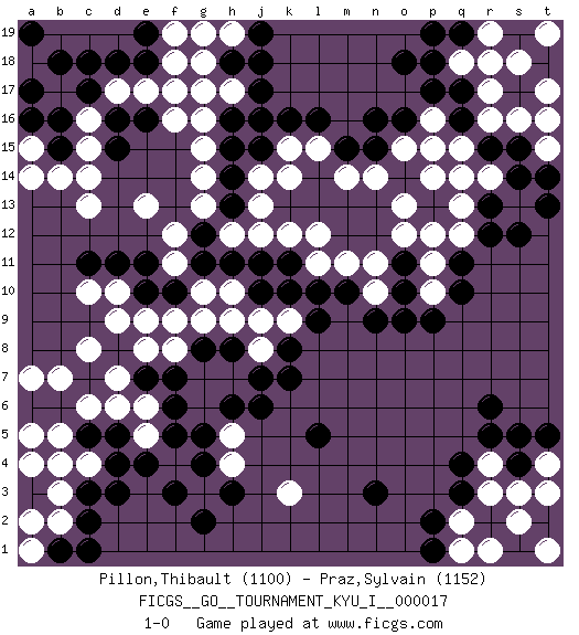 Last move : 1-0 2009 July 21 1:1:7 [Event "FICGS__GO__TOURNAMENT_KYU_I__000017"] [Site "FICGS"] [Date "2009.07.05"] [Round "1"] [Black "Pillon,Thibault"] [White "Praz,Sylvain"] [Result "1-0"] [Rating 1 "1100"] [Rating 2 "1152"] 1.q17 c4 2.q4 d17 3.e4 q15 4.p15 r17 5.q16 r16 6.r15 q14 7.s15 q18 8.p18 r18 9.p17 s16 10.r13 q13 11.r12 q12 12.q11 o13 13.k16 p11 14.q10 h17 15.h16 g16 16.j17 g17 17.h15 c13 18.c3 k3 19.h3 b3 20.d3 b5 21.n3 c8 22.c11 e13 23.e11 d10 24.d11 c10 25.t18 s18 26.t16 t17 27.s17 r14 28.s14 t17 29.p12 o12 30.s17 s13 31.s12 t17 32.p13 p14 33.s17 t14 34.t13 t17 35.d18 t19 36.c17 c16 37.d16 e17 38.b16 c15 39.e18 f18 40.b15 b14 41.c18 g15 42.h14 g14 43.r6 r3 44.q3 r4 45.r5 q2 46.p2 s2 47.s4 s3 48.t5 r1 49.l5 e5 50.f5 e6 51.f6 f8 52.g11 f11 53.f10 f12 54.e10 g10 55.g9 h10 56.g8 f9 57.f7 e8 58.e7 d7 59.o9 n10 60.n9 h12 61.m10 m11 62.l10 l11 63.n15 j9 64.k7 h7 65.h8 j8 66.j7 g7 67.h6 h9 68.k11 k12 69.j11 j12 70.k10 l12 71.h11 m14 72.m15 l15 73.l16 n14 74.p1 q1 75.d5 d6 76.c5 c6 77.d4 a15 78.a17 b2 79.b4 a4 80.b6 a5 81.c2 g6 82.g5 p10 83.p9 o15 84.o16 p16 85.n16 p15 86.k8 k14 87.h18 g18 88.j19 j14 89.a3 c4 90.s1 t1 91.b4 a2 92.a6 c4 93.d8 d9 94.b4 h5 95.j6 c4 96.d15 c14 97.b4 f4 98.g4 c4 99.f17 f16 100.b4 g3 101.f3 c4 102.e16 f17 103.b4 h4 104.g2 c4 105.g8 b7 106.h8 g9 107.o10 n11 108.o11 p12 109.b1 a7 110.h13 j13 111.g12 g13 112.q19 r19 113.o18 a1 114.c1 k15 115.j16 a14 116.a16 k9 117.l9 h19 118.g19 f19 119.b18 t3 120.p19 h19 121.j18 t15 122.t16 t15 123.e19 t16 124.b4 a18 125.a19 c4 126.t14 t4 127.s5 b4 128.j15 g19 129.j10 e9 130.pass pass 131.pass 1-0 Here are the names of the openings (joseki) played in the four corners : Corner d4 : c4 e4 Komoku (Somok, Xiao~mu`) 3-4 Point. The komoku (3-4) point is the traditional corner enclosure move.. Ikken Takagakari (Hankan Nop'dakeolch'im, Yi Gaogua`jiao~, 1-Space High Approach). The 5-4 approach move has become more popular in modern times, as modern Go emphasizes speed and influence. Corner q16 : q17 q15 Komoku (Somok, Xiao~mu`) 3-4 Point. The komoku (3-4) point is the traditional corner enclosure move.. Ikken Takagakari (Hankan Nop'dakeolch'im, Yi Gaogua`jiao~, 1-Space High Approach). The 5-4 approach move has become more popular in modern times, as modern Go emphasizes speed and influence. Player Black won this Go (weiqi, baduk) game. Follow this game move after move (download)Ikken tobi is never wrong. (Anonymous) There are three kinds of lies: lies, damned lies and statistics. (Mark Twain)