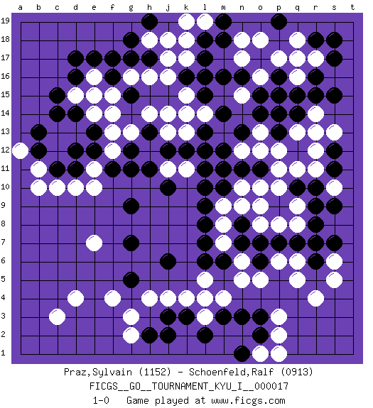 Last move : 1-0 2009 August 1 19:48:10 [Event "FICGS__GO__TOURNAMENT_KYU_I__000017"] [Site "FICGS"] [Date "2009.07.05"] [Round "1"] [Black "Praz,Sylvain"] [White "Schoenfeld,Ralf"] [Result "1-0"] [Rating 1 "1152"] [Rating 2 "0913"] 1.r16 d4 2.d17 r4 3.c15 p3 4.r10 k4 5.k16 e15 6.f16 f14 7.d14 d10 8.c11 c10 9.d11 e11 10.e12 f12 11.f11 e10 12.e13 f13 13.g11 e14 14.d12 d15 15.c14 e16 16.e17 h14 17.k14 j13 18.k12 k13 19.l13 l14 20.l12 k15 21.l15 j14 22.m14 k14 23.m16 j16 24.h17 h16 25.g17 k17 26.l16 j17 27.l17 g16 28.j12 h12 29.h11 j11 30.j10 r13 31.q14 r14 32.r15 r11 33.s11 q11 34.q10 q13 35.p13 p12 36.p14 p10 37.o11 p11 38.s12 r12 39.r6 q6 40.q7 q5 41.p7 o9 42.n7 n5 43.l6 g3 44.o6 o5 45.g7 e7 46.g5 f4 47.j3 h4 48.m3 l5 49.k3 l3 50.l2 l4 51.o2 p2 52.o3 m4 53.n3 j4 54.h2 g2 55.j2 k11 56.l10 o12 57.n11 m11 58.l11 n10 59.m12 n12 60.m10 m9 61.n8 n9 62.l9 q9 63.r9 s10 64.s9 s13 65.s15 r7 66.s7 s6 67.r8 o8 68.o7 m8 69.l8 m7 70.m6 n6 71.l7 s5 72.p9 p8 73.n13 q8 74.m11 o10 75.j6 n18 76.l18 q17 77.r18 r17 78.s17 q18 79.s18 o13 80.o14 n15 81.n16 o16 82.o17 n17 83.p16 p17 84.o15 o18 85.p19 q16 86.q15 o16 87.p15 k18 88.g9 l19 89.m19 k19 90.m18 b11 91.b12 b10 92.g12 g13 93.h13 f15 94.f17 h18 95.g18 a12 96.b13 p6 97.r7 c3 98.h19 j18 99.d16 o1 100.n1 p1 101.g15 1-0 Here are the names of the openings (joseki) played in the four corners : Player Black won this Go (weiqi, baduk) game. Follow this game move after move (download)Attach to the strongest stone in a pincer. (Anonymous) For to win one hundred victories in one hundred battles is not the acme of skill. To subdue the enemy without fighting is the acme of skill. (Sun Tzu)