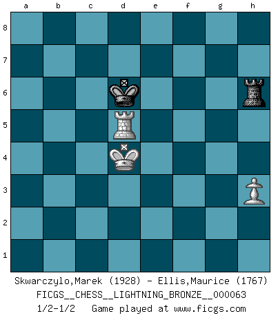 Last move : 1/2-1/2 2009 September 10 22:24:11 [Event "FICGS__CHESS__LIGHTNING_BRONZE__000063"] [Site "FICGS"] [Date "2009.09.10"] [Round "1"] [White "Skwarczylo,Marek"] [Black "Ellis,Maurice"] [Result "1/2-1/2"] [WhiteElo "1928"] [BlackElo "1767"] 1.d4 Nf6 2.Nf3 d5 3.c4 e6 4.Nc3 Nc6 5.e3 Bd7 6.cxd5 exd5 7.Bd3 Bd6 8.O-O O-O 9.Nb5 Be6 10.Nxd6 Qxd6 11.Ng5 Bd7 12.Bd2 h6 13.Nf3 Ne4 14.Rc1 Rfe8 15.Qc2 Bg4 16.Ne1 a6 17.a3 Bf5 18.Nf3 Nxd2 19.Nxd2 Bxd3 20.Qxd3 Re6 21.Nf3 Rae8 22.Rc3 Rg6 23.Rfc1 Qd7 24.Ne1 h5 25.b4 h4 26.h3 Re4 27.Kf1 Rf6 28.b5 axb5 29.Qxb5 Qe6 30.Qxb7 Rxe3 31.Rxc6 Rxe1+ 32.Rxe1 Qxc6 33.Qc8+ Kh7 34.Qg4 g6 35.Qxh4+ Kg7 36.Kg1 Qc3 37.Re5 Qc1+ 38.Kh2 Qd2 39.Rxd5 Rxf2 40.Qg3 c6 41.Rd6 Rf5 42.Rxc6 Qxd4 43.Qc3 Qxc3 44.Rxc3 Ra5 45.g4 f5 46.g5 Kf7 47.Re3 Ra4 48.Kg2 Rc4 49.Kf3 Ra4 50.Ke2 Rh4 51.Kd3 Rh5 52.a4 Rxg5 53.Kd4 Rg1 54.Ra3 Rd1+ 55.Kc5 Rc1+ 56.Kd5 Rd1+ 57.Ke5 Re1+ 58.Kf4 Kf6 59.a5 g5+ 60.Kf3 Re7 61.a6 Ra7 62.Ke3 Ke5 63.Ra5+ Ke6 64.Kd4 Kd7 65.Rxf5 Rxa6 66.Rxg5 Rh6 67.Rd5+ Kc6 68.Rc5+ Kd6 69.Rd5+ 1/2-1/2 Comment by player 2 : Maurice Ellis : Wanted to play a 30 minute game,not a marathon?? Expected 68.Rg3 Queen's pawn game Kingside Castling by player White (move 8) Kingside Castling by player Black (move 8) 10 pieces endgame at move 43 : White KRPPP , Black KQRPP WHITE : King + 1 Rook 3 Pawns BLACK : King + 1 Queen 1 Rook 2 Pawns 9 pieces endgame at move 44 : White KRPPP , Black KRPP WHITE : King + 1 Rook 3 Pawns BLACK : King + 1 Rook 2 Pawns 8 pieces endgame at move 52 : White KRPP , Black KRPP WHITE : King + 1 Rook 2 Pawns BLACK : King + 1 Rook 2 Pawns 7 pieces endgame at move 65 : White KRPP , Black KRP WHITE : King + 1 Rook 2 Pawns BLACK : King + 1 Rook 1 Pawn 6 pieces endgame at move 65 : White KRP , Black KRP WHITE : King + 1 Rook 1 Pawn BLACK : King + 1 Rook 1 Pawn 5 pieces endgame at move 66 : White KRP , Black KR WHITE : King + 1 Rook 1 Pawn BLACK : King + 1 Rook This chess game ended in a draw. Follow this game move after move (download)A man without frontiers. He didn't divide the East and the West, he brought them together in their admiration for him. (Ljubomir Ljubojevic, about Bobby Fischer's death) Ja, ich habe einmal eine Blitzpartie gespielt, es war in einem Zug, 1929. --im Interview 1989 (Mikhail Moiseyevich Botvinik) Si el Ajedrez es una ciencia, es la mas inexacta. Si el Ajedrez es un arte, es demasiado inexacto para ser visto como tal. Si el Ajedrez es un deporte, es demasiado esotérico. Si el Ajedrez es un juego, es demasiado exigente para ser solo un juego. Si el Ajedrez es una aventura, es una muy demandante. Si el Ajedrez es una pasión, es una muy gratificante. Si el Ajedrez es la vida, es una muy triste. (Anónimo) Les échecs, c'est l'imagination. (David Bronstein) The problem with troubleshooting is that trouble shoots back. (Anonymous)