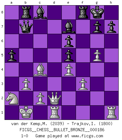 Last move : 1-0 2010 April 10 17:58:20 [Event "FICGS__CHESS__BULLET_BRONZE__000186"] [Site "FICGS"] [Date "2010.04.10"] [Round "1"] [White "van der Kemp,Michel"] [Black "Trajkov,Ivan"] [Result "1-0"] [WhiteElo "2039"] [BlackElo "1800"] 1.e4 c5 2.Nf3 d6 3.d4 cxd4 4.Nxd4 Nf6 5.Nc3 a6 6.f3 Nc6 7.Be3 e6 8.Qd2 Be7 9.O-O-O O-O 10.g4 Nd7 11.h4 Nxd4 12.Qxd4 Ne5 13.Be2 b5 14.Kb1 Nc6 15.Qd2 Qa5 16.a3 Rb8 17.Bg5 f6 18.Bf4 b4 19.axb4 Qxb4 20.b3 Ne5 21.Na2 Qb7 22.g5 fxg5 23.hxg5 a5 24.Bxe5 dxe5 25.Bc4 1-0 Sicilian : Najdorf Queenside Castling by player White (move 9) Kingside Castling by player Black (move 9) Player White won this chess game. Follow this game move after move (download)The defensive power of a pinned piece is only imaginary. (Aaron Nimzovich) Der Schachmeister von Heute braucht Courage, einen Killerinstinkt, Ausdauer und Arroganz. (Larry Evans) Ciertamente, de todas la drogas del mundo, el Ajedrez debe ser el mas placentero permamentemente. (Assiac) Ce n'est pas pour s'amuser qu'il joue aux échecs : il célèbre un culte. (Vladimir Nabokov) I couldn't make any sense out of what this particular thread is about. It sounds like R2 D2 computer speaking. A space fight ?!? Some 'command' problems in Moscow ? Some killers & narcotic addicts attacking some game & a god wannabe ?? (Dinesh De Silva, lost in a russian conflict in FICGS forum)