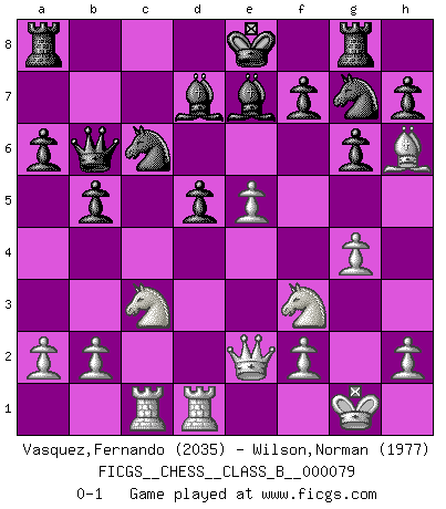 Last move : 0-1 2009 October 25 7:28:51 [Event "FICGS__CHESS__CLASS_B__000079"] [Site "FICGS"] [Date "2009.07.07"] [Round "1"] [White "Vasquez,Fernando"] [Black "Wilson,Norman"] [Result "0-1"] [WhiteElo "2035"] [BlackElo "1977"] 1.e4 c5 2.d4 cxd4 3.c3 dxc3 4.Nxc3 Nc6 5.Nf3 d6 6.Bc4 e6 7.O-O Nf6 8.Qe2 Bd7 9.Rd1 Qb8 10.Bf4 Nh5 11.Be3 Be7 12.e5 d5 13.Bb5 g6 14.Bh6 Rg8 15.g4 Ng7 16.Ba4 a6 17.Rac1 b5 18.Bb3 Qb6 19.Bxd5 exd5 0-1 This chess game has been lost on time (started : 2009.07.07 16:39:35) Sicilian : Smith-Morra gambit Kingside Castling by player White (move 7) Player Black won this chess game. Follow this game move after move (download)Chess is the art of analysis. (Mikhail Botvinnik) Wir irren allesamt, nur jeder irrt anders. (Georg Christoph Lichtenberg) Cada Peón es una Reina en potencia. (James Mason) Toutes les manuvres exécutées sur une colonne ouverte ont pour but ultime l'intrusion définitive sur la septième ou la huitième rangée, en plein cur de la position ennemie. (Aaron Nimzovitch) Rules and bones are meant to be broken. (Anonymous)